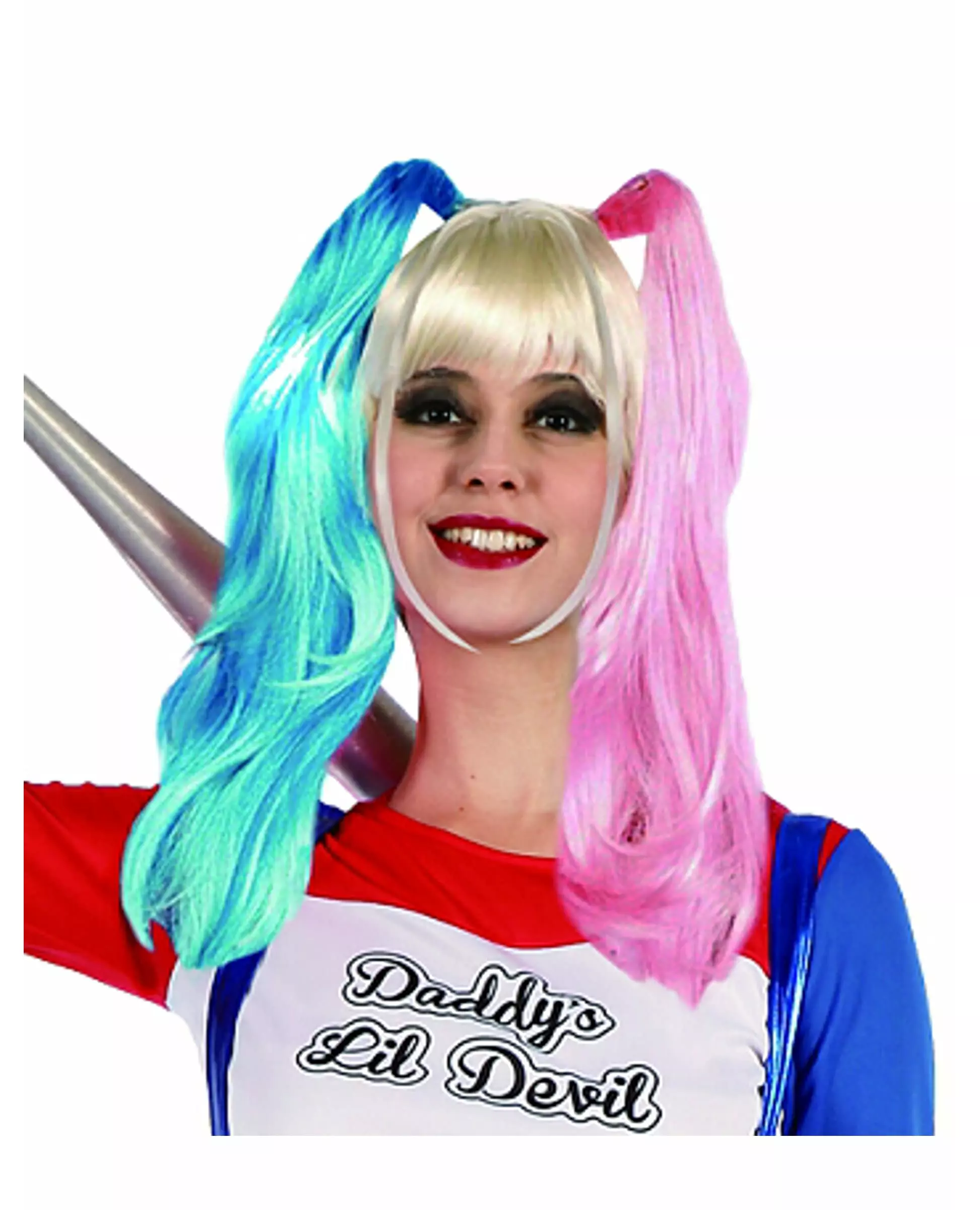 Bli berømt og gal! Denne djevelske harlekinparykken er for kvinner. Den representerer frisyren fra en berømt superskurkfilm. Blond i fargen med to musefletter på den rosa og blå siden. Ideell for å fullføre kostymet ditt til en berømt skurkheltinne under en kostymefest. Inkludert tilbehør: parykk Materiale: 100 % syntetisk