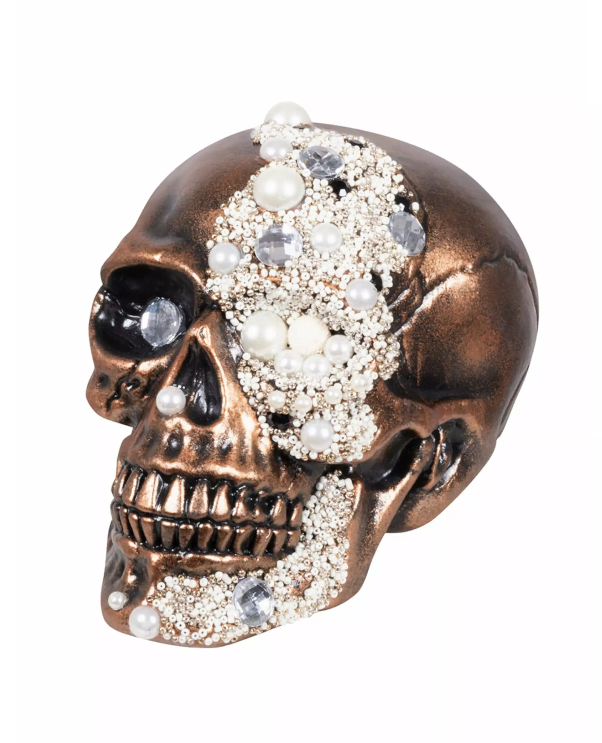 En hodeskalle utsmykket med diamanter! Denne dekorasjonen forestiller en kobberhodeskalle. Denne skjeletthodeskallen måler omtrent 16 x 15 x 21 cm. Den er dekorert med falske diamanter på den ene siden av ansiktet. Denne elegante og skremmende polyetylendekorasjonen vil være perfekt for å fullføre borddekorasjonen din til Halloween! Inkludert tilbehør: 1 Dekorasjonsmateriale: 100 % polyetylen