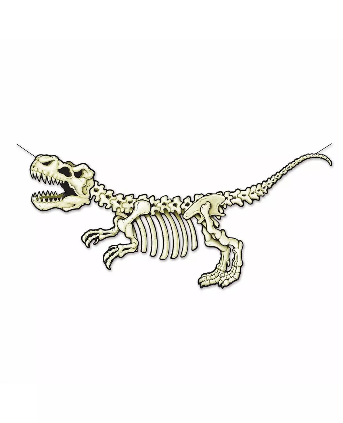 Gå tilbake til forhistorisk tid! Dette banneret er laget av papp og danner et dinosaurskjelett, omtrent 152 cm langt og 71 cm bredt. Denne girlanderen vil være ideell for en bursdagsdekorasjon med dinosaurtema!. Inkludert tilbehør: 1 banner Materiale: Papp