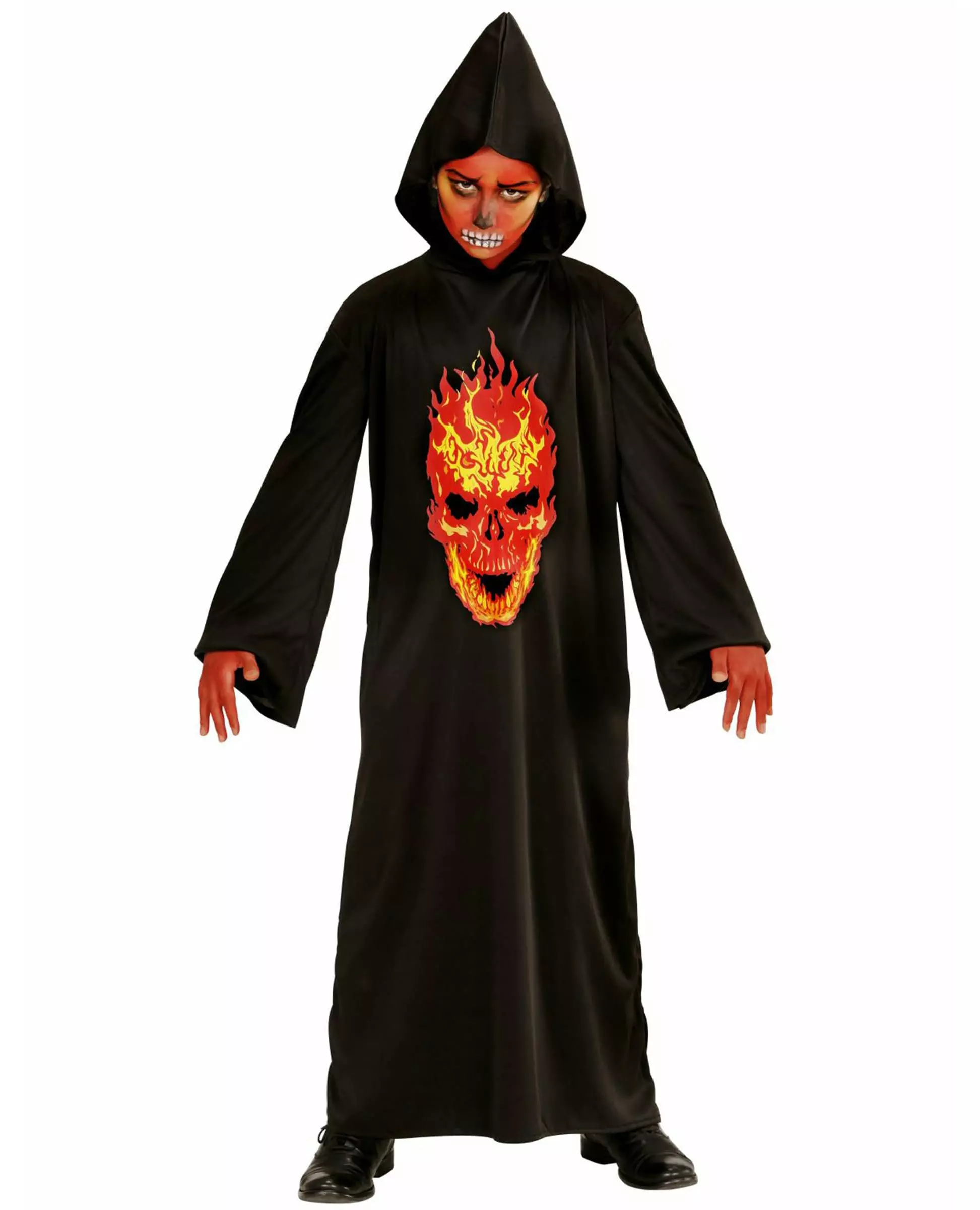 Vokt dere for djevelen! Dette djevelhøsterkostymet er for barn. Det består av en tunika med hette. Tunikaen er svart med lange ermer. En spiss, svart hette er sydd fast på tunikaen. Denne tunikaen har et brennende djevelhode. Til Halloween eller en temafest kan du spille rollen som en djevelhøster fra helvete. Inkludert tilbehør: tunika med hette, Materiale: 100 % polyester,