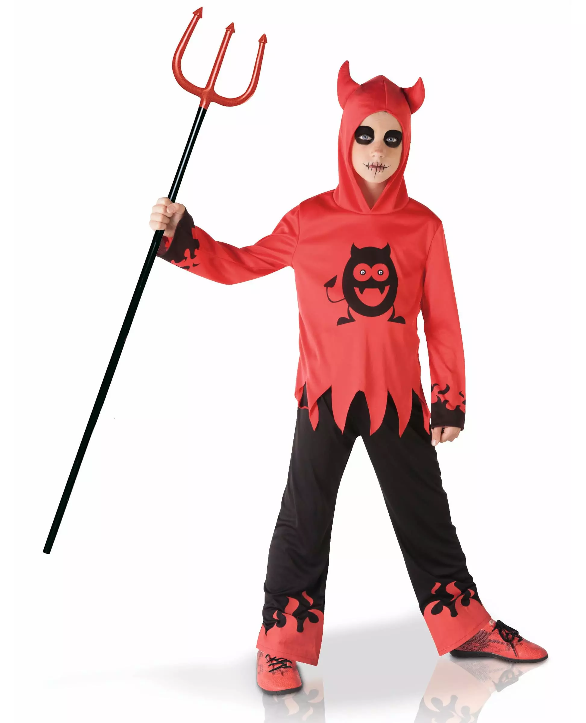 En søt liten djevel! Dette djevelkostymet består av en topp og bukser (trfork og sko er ikke inkludert). Settet er rødt og svart. Toppen har lange ermer og en påsydd hette med djevelhorn. Et svart flammemønster er tilstede på endene av ermene, og en svart djevel med googly-øyne er trykt på forsiden. Nederdelene er kuttet i spisser for en djevelsk revet effekt! De svarte buksene har en elastisk linning. De er trykt med røde flammer på nedre del av bena. Dette kostymet vil være uunnværlig for barnets Halloween-fest eller for en engler og demoner-kveld! Inkludert tilbehør: Hettegenser Bukser Materiale: 100 % polyester Vedlikehold: Håndvask