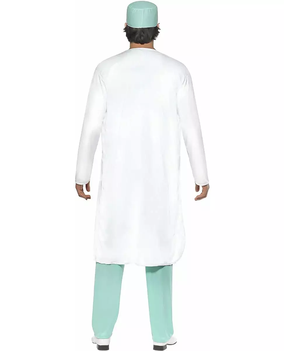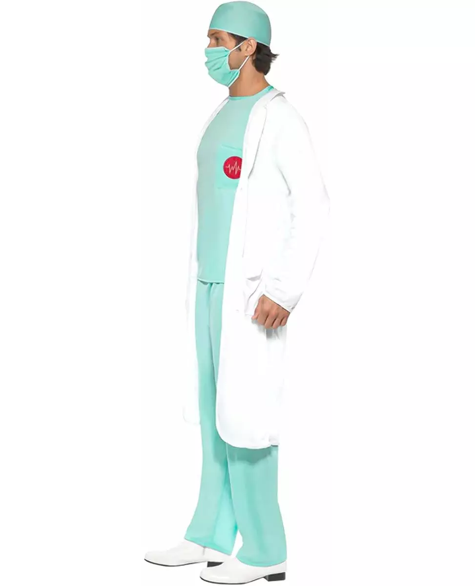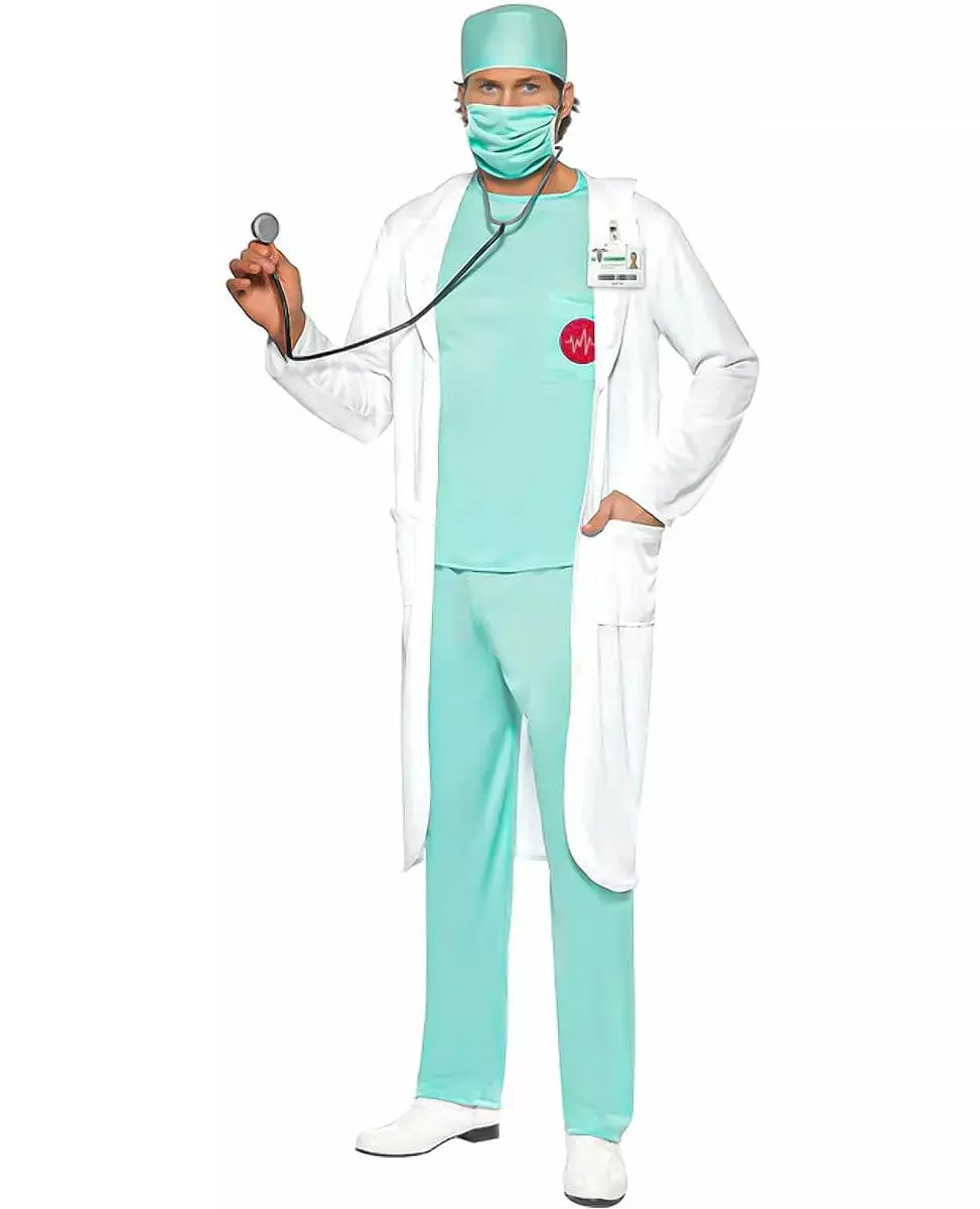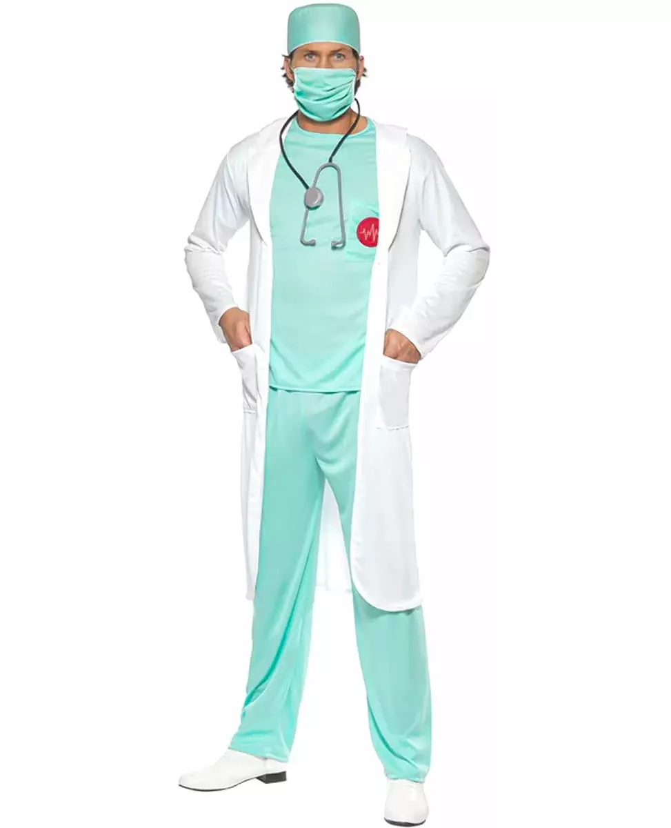 Bli en berømt kirurg til en utkledningsfest. Dette legekostymet for menn inkluderer en hatt, en bluse, en topp, bukser, en maske og et merke (stetoskop og sko er ikke inkludert). Toppen og buksene er lysegrønne. Et rødt kors dekorerer venstre side av toppen. Masken og luen matcher antrekket. De er lysegrønne i fargen og fullfører kostymet perfekt. En lang hvit bluse og et merke setter prikken over i-en på antrekket. Du er nå klar til å behandle pasientene dine med største omhu. Inkludert tilbehør: Topp Bukser Bluse Hatt Maske Merke Materiale: 100 % polyester Pleie: Håndvask