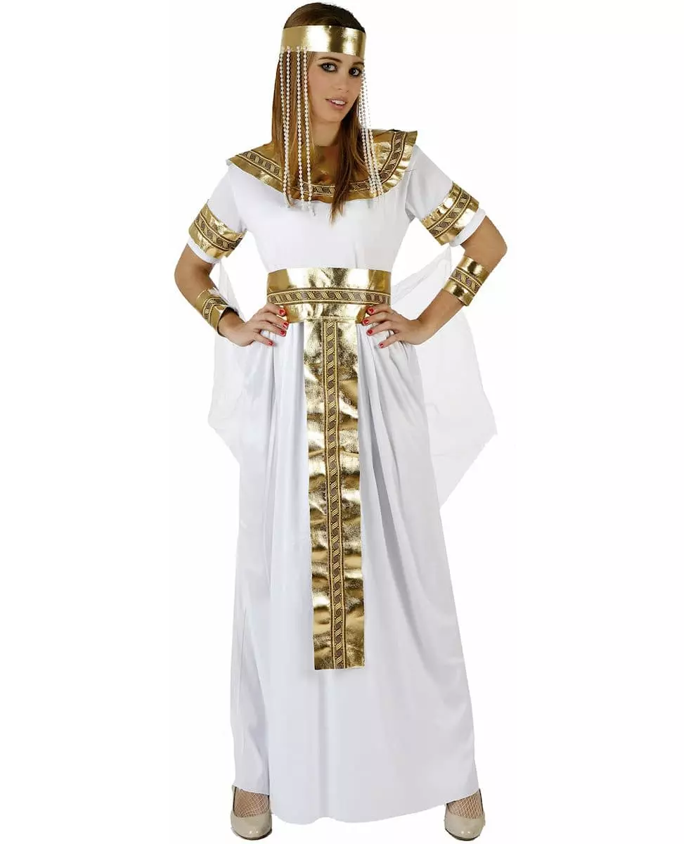 En dronning med karakter! Dette Nilens dronning-kostyme for kvinner består av en lang hvit tunika med gjennomsiktige slør, hodeplagg, belte, krage og matchende gullarmbånd. Perletråder er sydd til det gullfargede hodeplagget. Bli Egypts vakreste dronning med dette lette og behagelige antrekket til utklednings- eller temafester, til et show eller andre utkledningsarrangementer. Inkludert tilbehør: Tunika Hodeplagg Belte Krage Armbånd Materiale: 100 % polyester Stell: For hånd