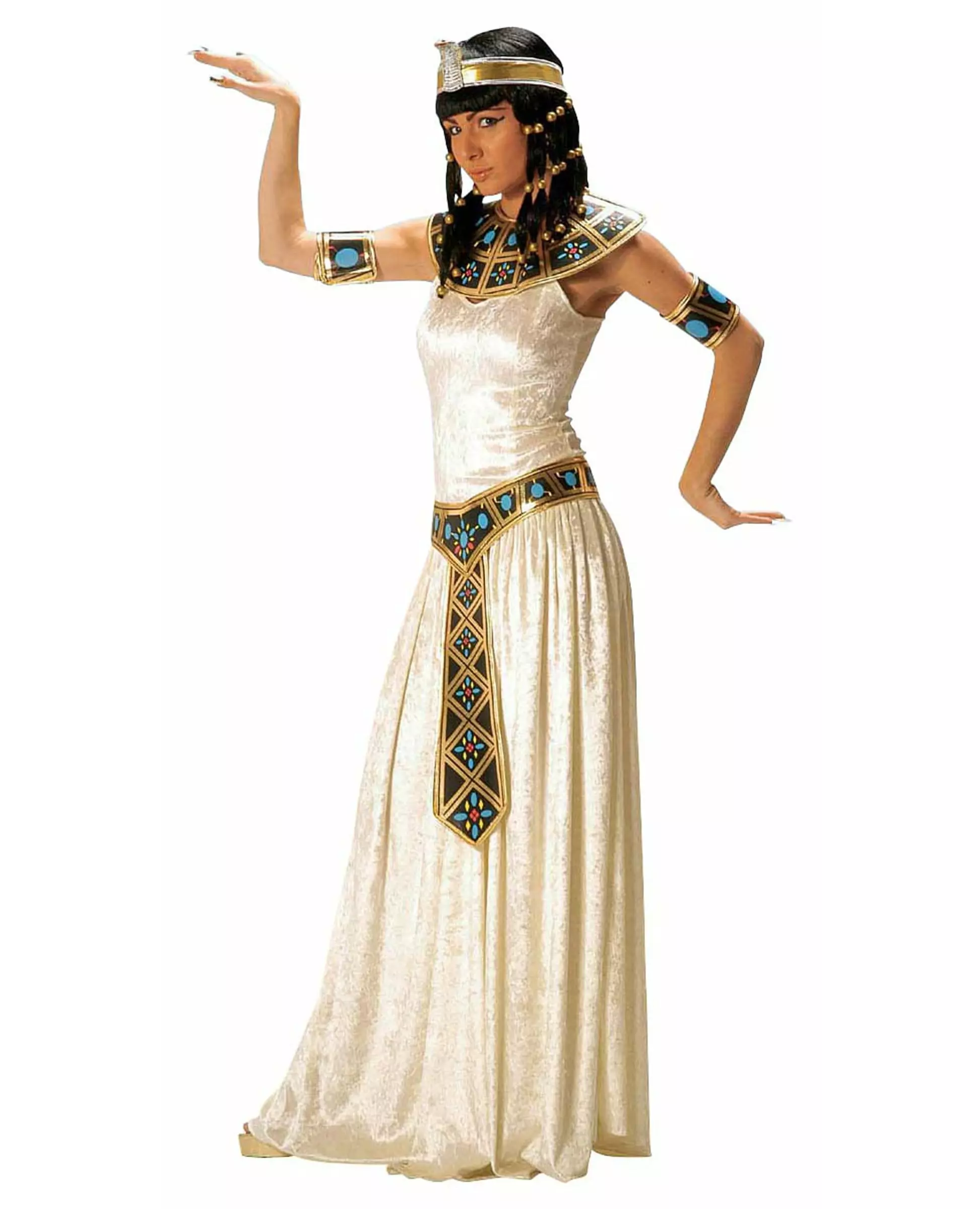 Et komplett sett! Dette egyptiske kostymet er for kvinner og inkluderer en kjole, et halskjede, et belte og to armbånd (hodeplagg og sko er ikke inkludert). Midtpunktet er den lange, kremhvite fløyelskjolen. Den har tynne stropper og lukkes bak med en lang glidelås. Den er tettsittende i midjen. En choker med gull- og turkise mønstre knytes rundt halsen. Stoffet den er laget av (samt resten av tilbehøret) minner om skinnende metallisk papir. Interiøret er laget av stoff for å sikre komfort. Du kan stramme midjen med det medfølgende beltet. Det festes bak med borrelås. Til slutt vil to ermer pryde armene dine. De festes også med borrelås. Legemliggjør en dronning av Egypt med dette komplette kostymet til karneval! Copyright Widmann SRL. Inkludert tilbehør: Kjole Halskjede Belte Armbånd Materiale: 100 % polyester Stell: For hånd Målinformasjon: For størrelse M er kjolen omtrent 154 cm lang.