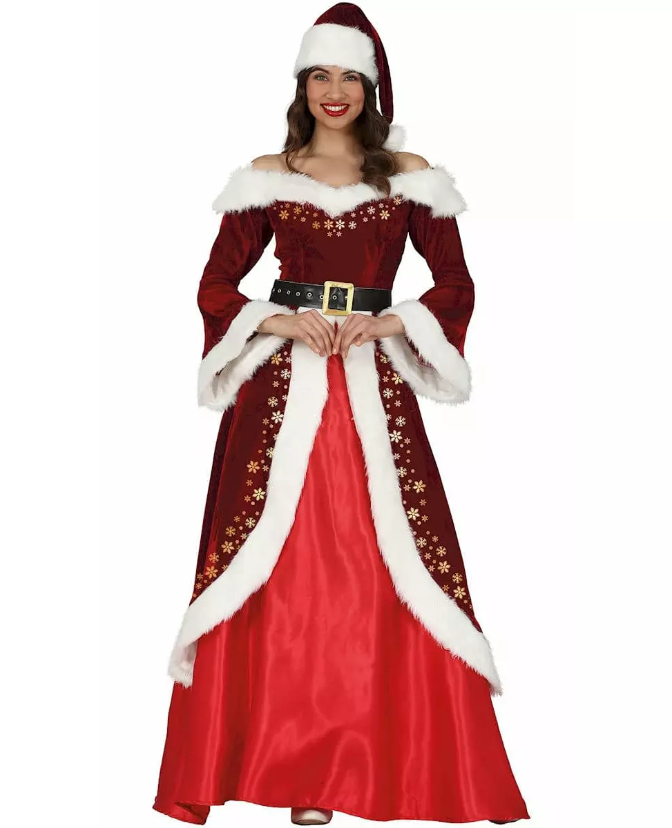 Vær elegant til jul! Dette elegante, forgylte julekostymet er for kvinner. Det består av en hatt, en kjole og et belte. Kjolen er lang og har et fløyelsutseende. Toppen er rød med lange, utsvingte ermer. Den har vakre gullsnøflak og en vakker fløyelseffekt. Kragen er dekket med hvit pels og faller over skuldrene. Nederdelen av kjolen er lyserød. Den er dekket med stoff i samme farge og med de samme gullmønstrene som toppen. Det svarte beltet med gullspenne vil fullføre kostymet perfekt. Hatten er rød og har vakker hvit pels. Vær elegant til julefesten med dette forgylte julefruekostymet! Inkludert tilbehør: Hatt Kjole Belte Materiale: 100 % polyester Vedlikehold: Håndvask