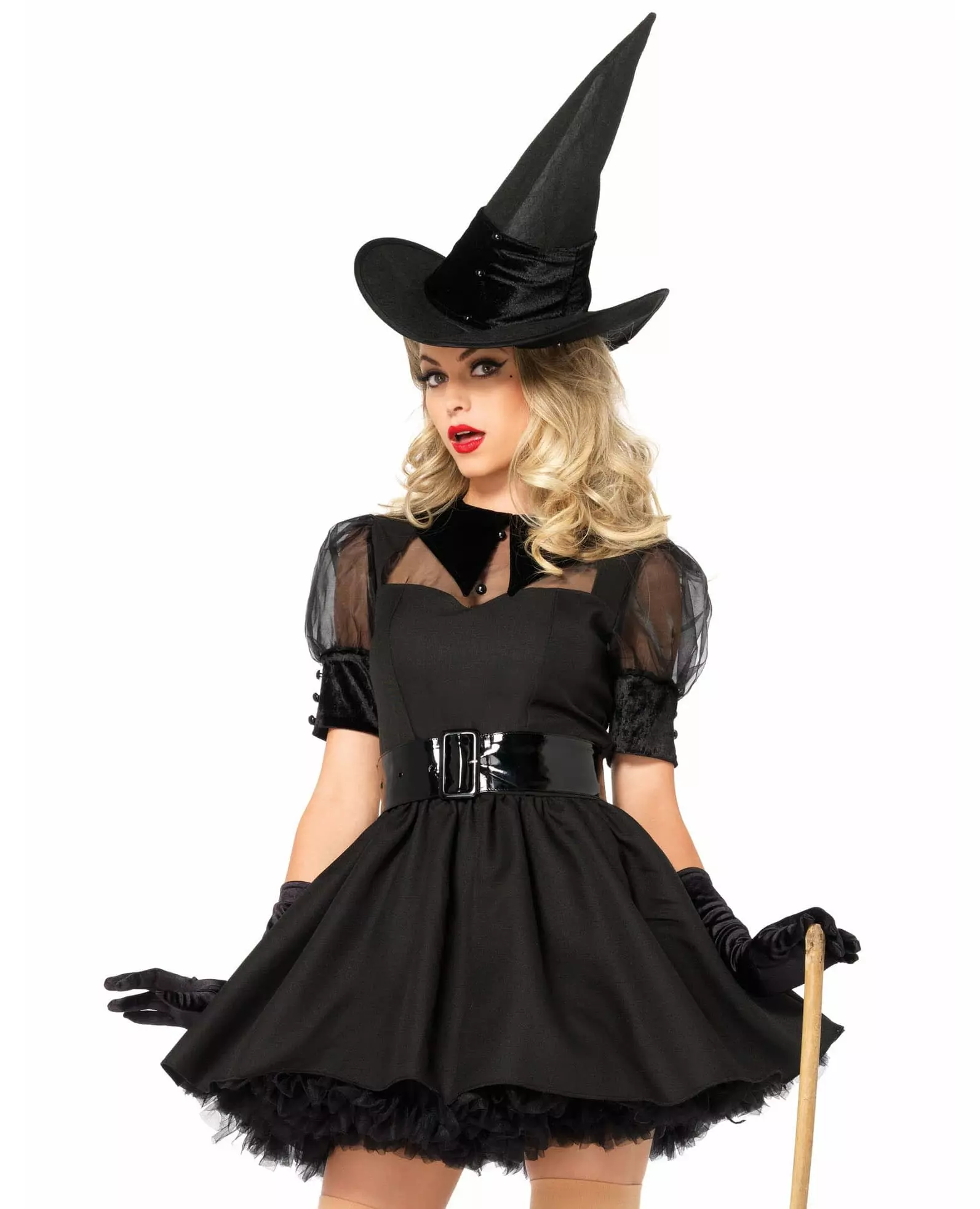 Til kosteskaftene! Dette heksekostymet for voksne består av en kjole, et belte og en hatt (hansker, kost, underskjørt og sko er ikke inkludert). Denne korte, svarte kjolen lukkes bak med glidelås. Den har et slør ved halsen og ermene. Kragen og mansjettene er laget av svart fløyel. Beltet med vinyleffekt er justerbart. Den svarte, ikke-vevde hatten er dekorert med en stripe fløyelsstoff nederst. Dette kostymet vil være perfekt for å forhekse gjestene dine til Halloween eller til en fest med et tema. Inkludert tilbehør: Kjole, belte, hatt Materiale: Polyester - Nylon Stell: For hånd