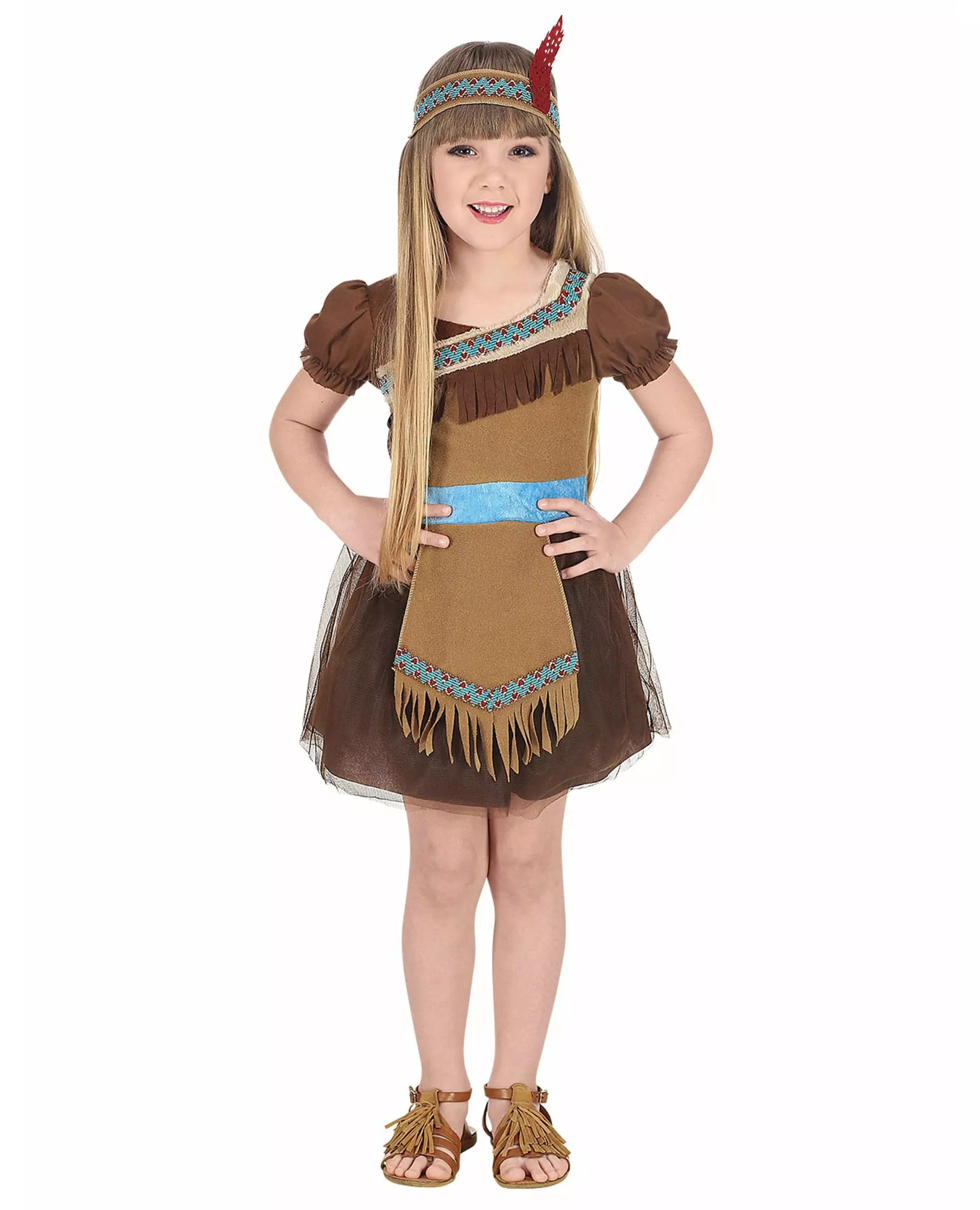 Forvandle datteren din til en søt indianer med dette kostymet. Dette lille indiske kostymet for jenter består av en kjole og et pannebånd (sko ikke inkludert). Den korte kjolen er brun med puffermer. Den er dekorert med frynser og lyseblå flette. Et lite forkle finnes nederst på kjolen. Pannebåndet er lysebrunt og blått. En falsk rød fjær er på siden. Dette kostymet vil være perfekt for datteren din når hun skal leke den lille indianeren på karnevalet. Inkludert tilbehør: Kjolepannebånd Materiale: 100 % polyester Vedlikehold: Håndvask