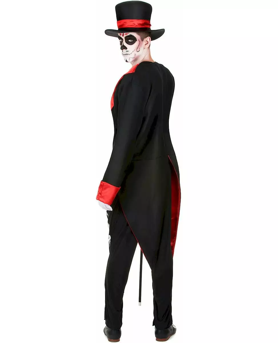 Du kommer til å se elegant ut! Dette Dia de los Muertos-skjelettkostymet er for menn og inkluderer en jumpsuit, en jakke og en hatt. Den ermeløse jumpsuiten har et skjeletttrykk kun på forsiden og lukkes med en sløyfe bak. Jakken, laget av tykt svart stoff, er ferdig med pen rød satengkant på kragen, ermeendene og kantene. Dette gir et snev av eleganse til dette kostymet. Til slutt vil hatten med metallramme og skumtekstur holde hodet ditt perfekt; i tillegg dekorerer et rødt satengbånd tilbehøret, som gjenspeiler jakkens finish. Dette stilige settet vil være perfekt for å feire Halloween med et Dia de los Muertos-tema. Inkludert tilbehør: Hatt Jakke Jumpsuit Materiale: 100 % polyester Vedlikehold: Håndvask