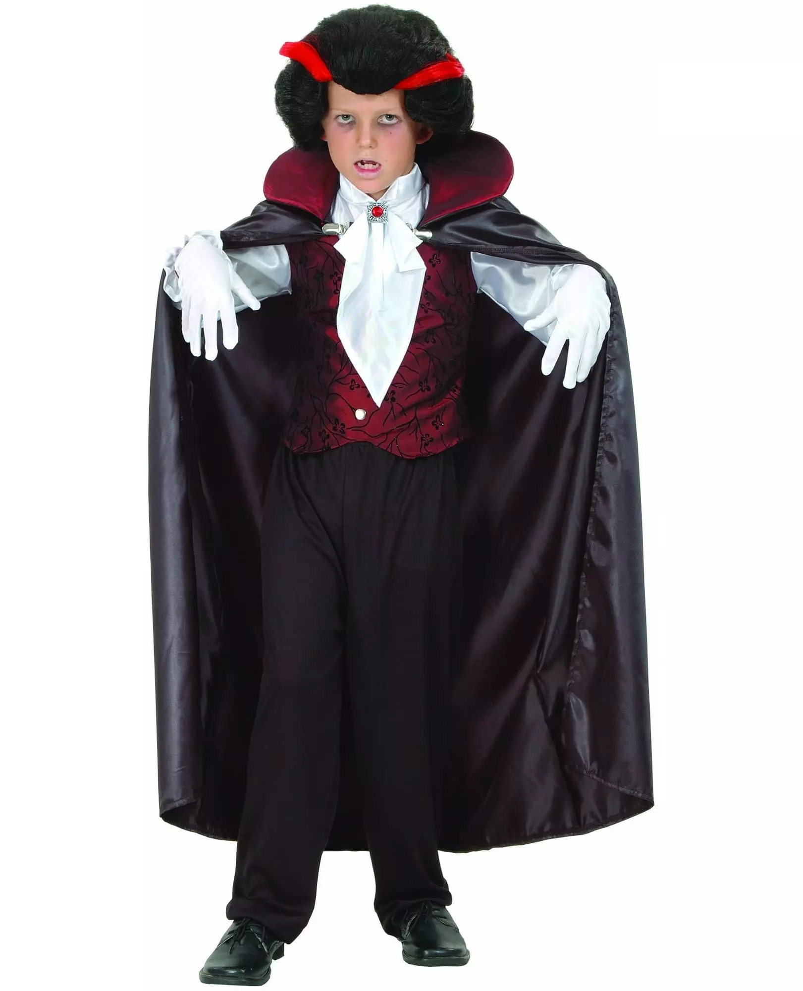 Spaser i gatene på jakt etter godbiter på Halloween-kvelden. Dette vampyrkostymet for gutter består av en vest med ermer, en kappe og bukser. Toppen er en mørkerød vest med hvite ermer. Svarte blomstermønstre er på bysten. Nederdelen av ermene er elastikk. Ved kragen er det en lang hvit jabot dekorert med en falsk rød edelsten. Denne toppen lukkes øverst bak med borrelås. Buksene er ensfargede svarte. De er elastikk i livet. En lang kappe fullfører kostymet. Kappen er svart med en bred rød krage inni. Denne lukkes foran. Dette kostymet vil være perfekt for å skifte til en bloddrikker på Halloween-kvelden eller for en grøsserkveld. Inkludert tilbehør: Topp, kappe, bukser Materiale: 100 % polyester Vedlikehold: Håndvask