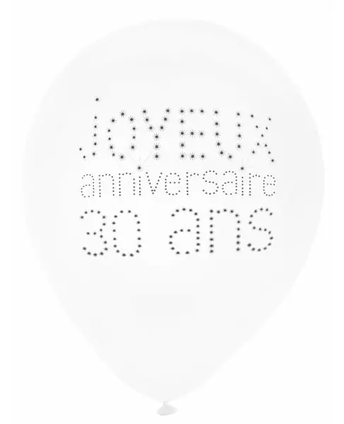 Jippi!! 30 år! Denne pakken inneholder 8 lateksballonger. Når de er oppblåst, har ballongene en diameter på 23 cm. De er hvite, og skriften «HAPPY 30TH BIRTHDAY» er svart i midten. Disse vakre ballongene er ideelle for å lage en elegant og glamorøs dekorasjon til din 30-årsdag. Inkludert tilbehør: 8 ballonger Materiale: Lateks