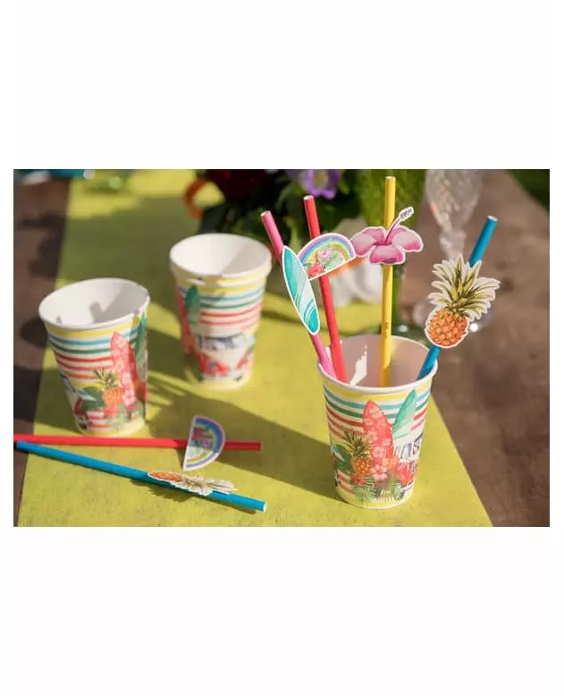 Aloha! Surf, beach and vacation in these cups! With these multicolored cups that smell of vacation and sun, let's go for cocktails in a good mood! This set consists of 10 Hawaiian cups measuring 7.8 cm by 9.7 cm. A van, surfboards, hibiscus flowers... If you have a Hawaiian or tropical party planned, these cups will bring sunshine to your buffet! Accessories included: 10 Cups Material: Cardboard