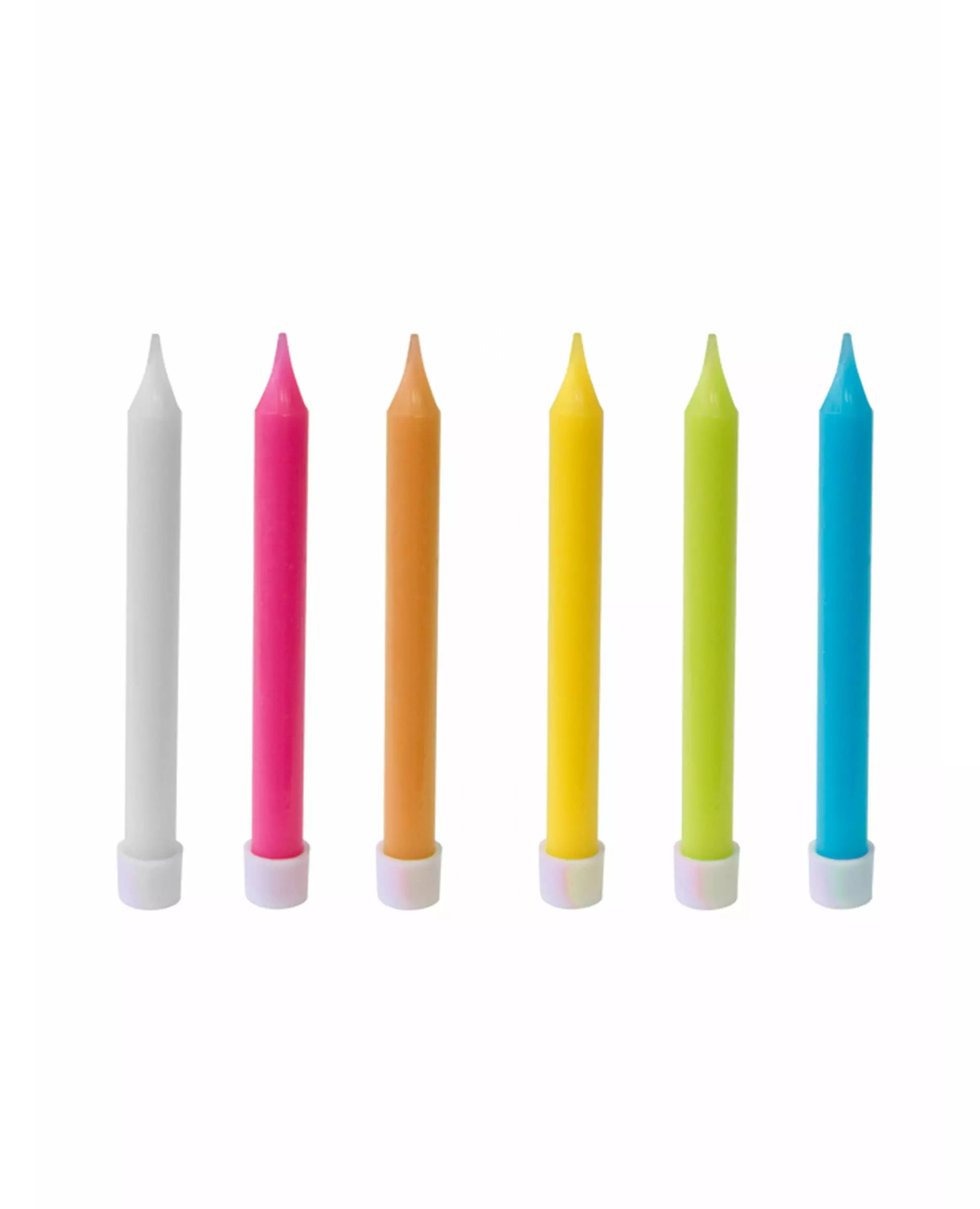 Neon on your cake! These long candles, approximately 8 cm long, are sold in packs of 10. Fluorescent in color, they are blue, green, white, orange or pink and will brighten up your birthday cake or any other festive event! 10 white candle holders are also included. Your snack will be colorful and flashy with these decorative candles for a fun event!. Accessories included: 10 candles 10 candle holders