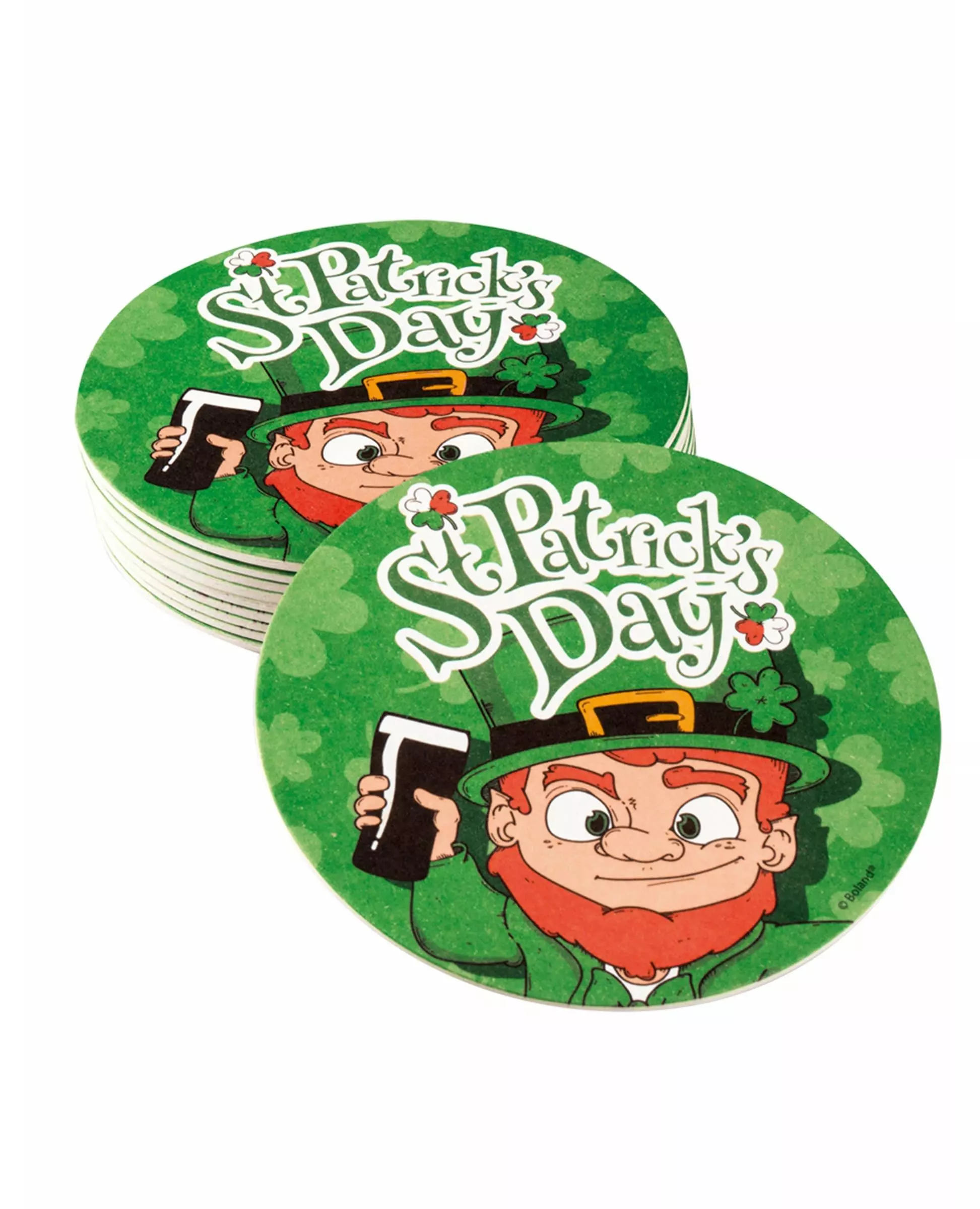 little leprechaun under your glasses! These 10 coasters measuring 10 cm represent an Irish leprechaun dressed in his famous hat and green suit who raises a glass of beer on a green background printed with clovers and with the inscription "St Patrick's Day". These coasters will be perfect for Saint Patrick's Day. Accessories included: 10 Coasters Material: Cardboard