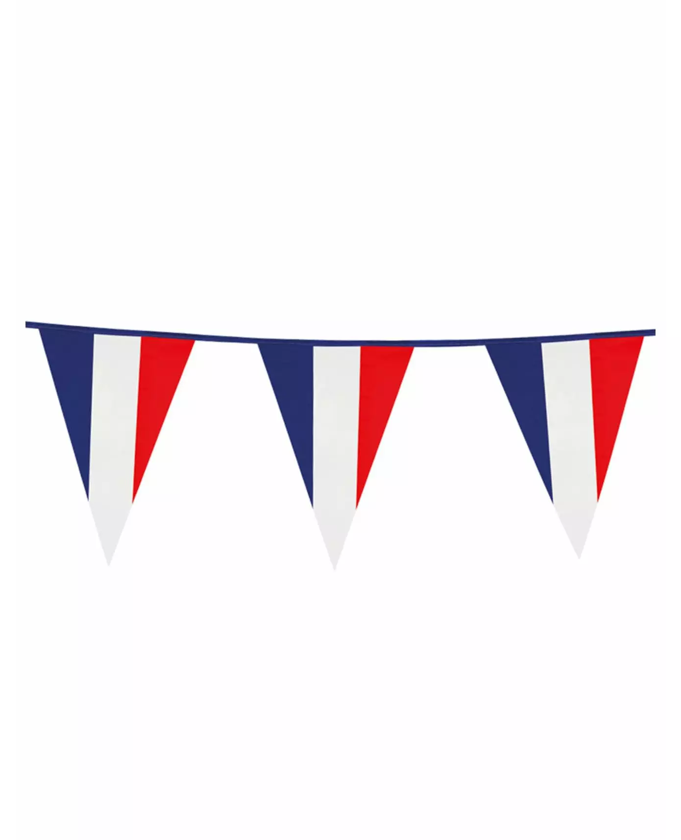 Support the Blues by creating a blue, white, red decoration! This garland measures approximately 10 m in length. It is made up of 8 plastic pennants in the colors of the French flag. Each pennant measures approximately 29 cm in height and 19 cm in width. These pennants are only printed on one side. This garland will be perfect to complete your supporter decoration for a sporting event such as the World Cup or the Euro. Accessories included: Garland Material: Plastic