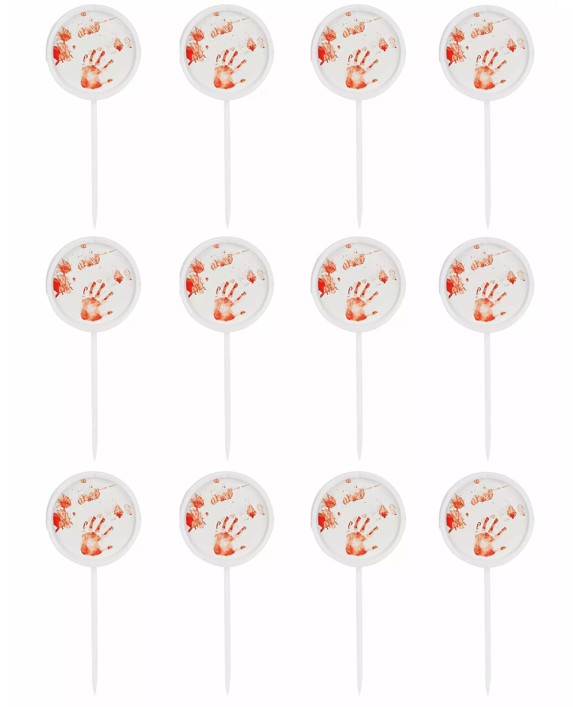 A horribly delicious cupcake decoration! This set includes 12 plastic Halloween decoration picks. Each 7.5 cm pick represents a white sign on which a sticker stained with blood and bloody hands appears on the front and back. To decorate your Halloween cupcakes or for other terrifyingly delicious snacks, these picks will be perfect in the hands of your bloodthirsty guests! Accessories included: 12 picks Material: Plastic