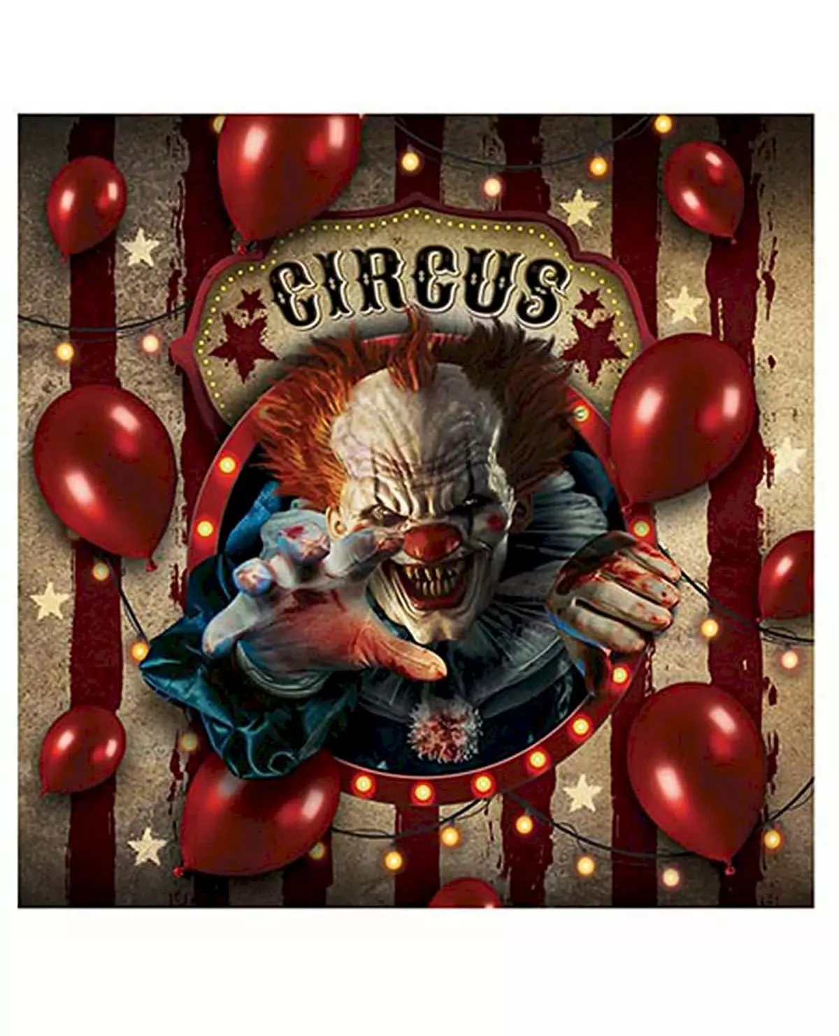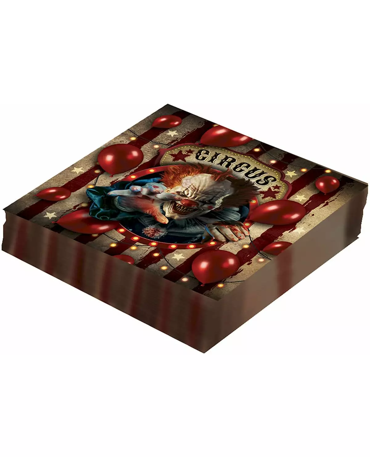 The Halloween Circus This set consists of 12 Halloween clown napkins measuring approximately 33 x 33 cm when unfolded. Made of paper, they are printed with a scary clown surrounded by red balloons. They have the inscription "Circus" in red letters. Enter the scary circus for your Halloween party with these Halloween clown napkins!. Accessories included: 12 napkins Material: Paper