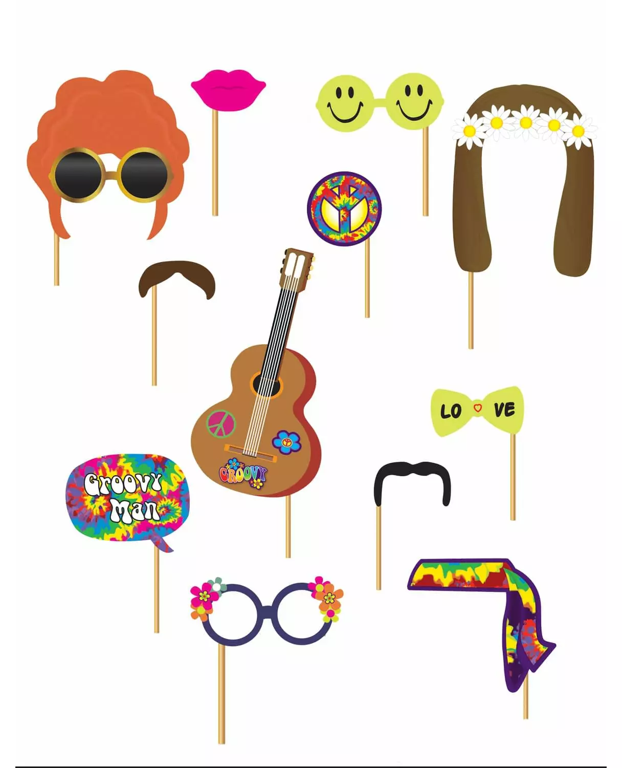 Entertain your friends with a photo booth! This hippie photo booth kit is made up of 12 cardboard stickers attached to plastic rods approximately 23 cm long. These cardboard stickers represent the following elements: - 1 bubble with colorful psychedelic patterns displaying the message "Groovy Man" - 1 bow tie with the words "Love" - 1 brown wig with a crown of white flowers - 1 pink mouth - 1 pair of opaque glasses representing smileys - 2 different mustaches - 1 multicolored headband - 1 puffy wig with sunglasses - 1 pair of round glasses with small flowers on the sides - 1 Peace and Love symbol - 1 hippie guitar This complete kit will be perfect for creating a photobooth animation for a retro evening. Accessories included: 12 Photobooth accessories Material: Cardboard