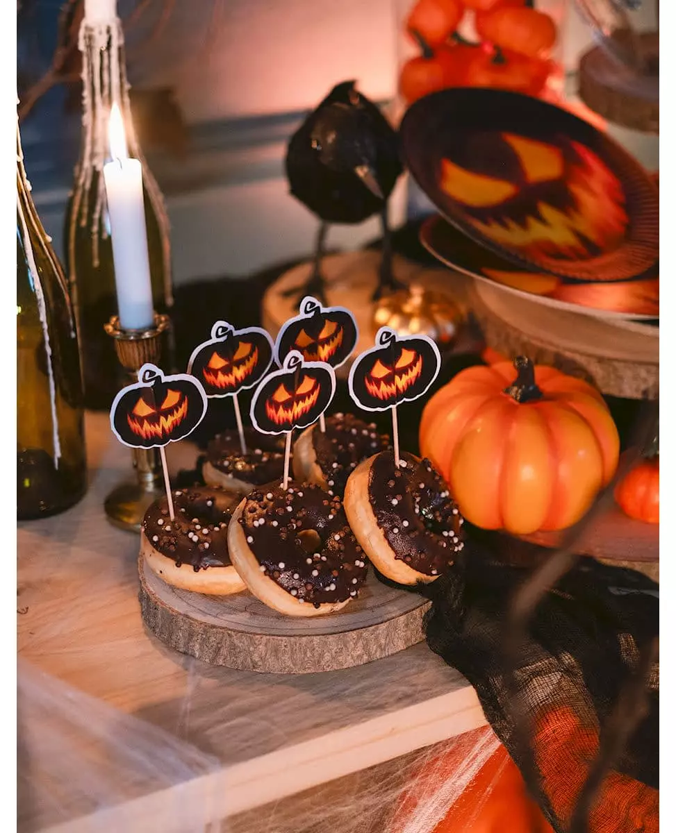 She's staring at you! This set contains 12 pumpkin picks that measure approximately 12 cm. These cocktail picks are made of wood. They are decorated with a cardboard sticker. They represent an evil black pumpkin with a fiery look and smile. These terrifying pumpkin picks are perfect for serving appetizers at your Halloween party. Accessories included: 12 Picks Material: Wood