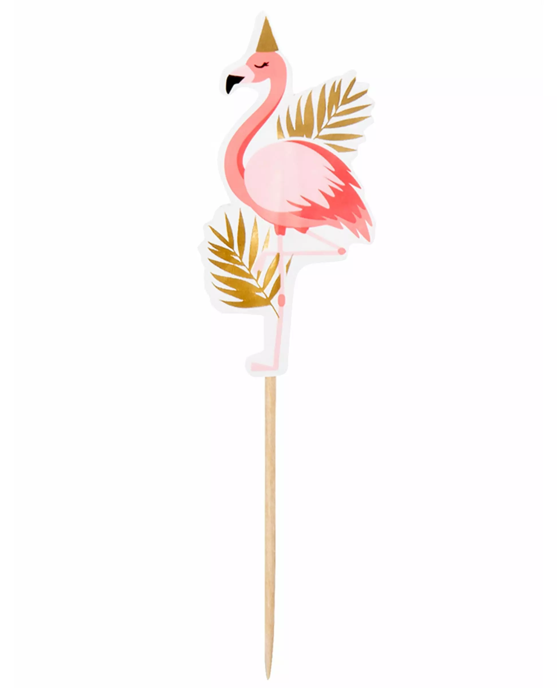 Pretty pink flamingos to decorate your appetizers! This set consists of 12 wooden picks. They measure approximately 13 cm in height and are decorated with a pink flamingo with a little party hat and golden tropical leaves. These picks will be perfect for adding a chic and fun touch to your appetizer bites. Accessories included: 12 Picks Material: Wood