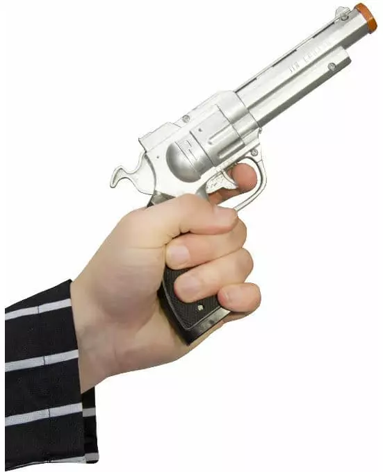 What's a gangster without his gun? This silver plastic revolver measures approximately 18 cm in length. Complete your gangster outfit with this pistol and rule the roost at Carnival or other themed parties! Accessories included: 1 Revolver Material: Plastic