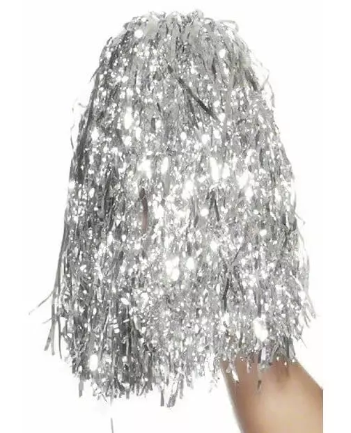 Add a touch of sparkle to your party accessories! Set of two silver-colored pom poms with white plastic handles, sold in pairs. They are 20cm long and can be carried with a handle. This pair of pom poms is the ideal accessory for playing cheerleaders on many occasions. Size information: - 2 pom poms