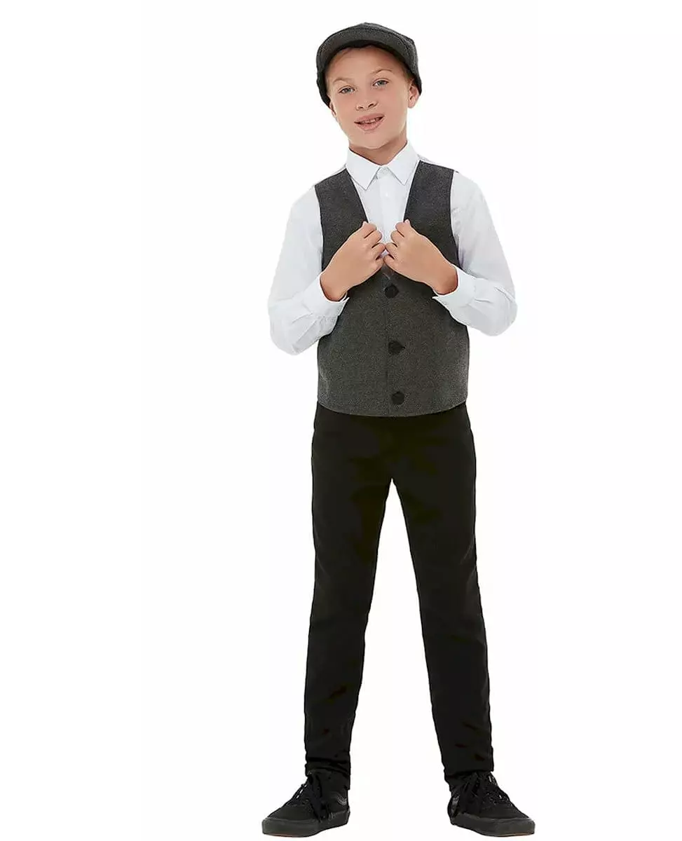 1920s Bandit! This 1920s kit for boys includes a beret and a waistcoat (shirt and trousers not included). The beret has a traditional shape. It is entirely gray. The waistcoat matches the beret. It is a sleeveless waistcoat with a row of 3 black buttons. This 1920s boys costume will make your son the most stylish boy at your fancy dress party!. Accessories included: Beret Waistcoat Material: 50% cotton, 50% polyester