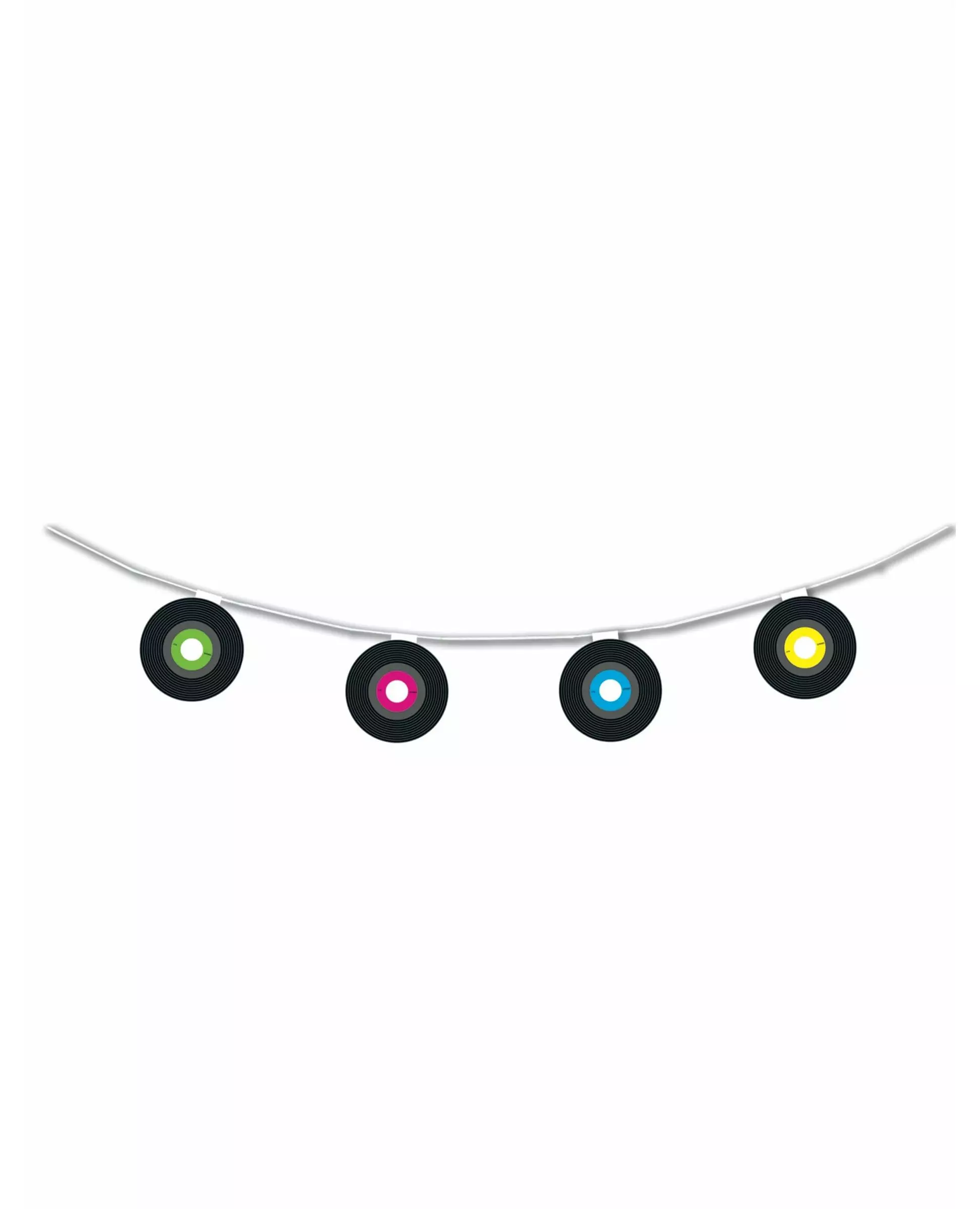 nostalgia evening with these vinyl records! This decoration is a fireproof paper garland. It is made up of a wide white cord 3.20 m long on which are sewn vinyl records made of fireproof paper 17 cm in diameter. Each record has a different color (blue, yellow, pink, green) in the center and is printed on both sides. Nostalgic for the 70s, this garland will perfectly complete a party decoration for a theme party!. Accessories included: 1 garland Material: Paper