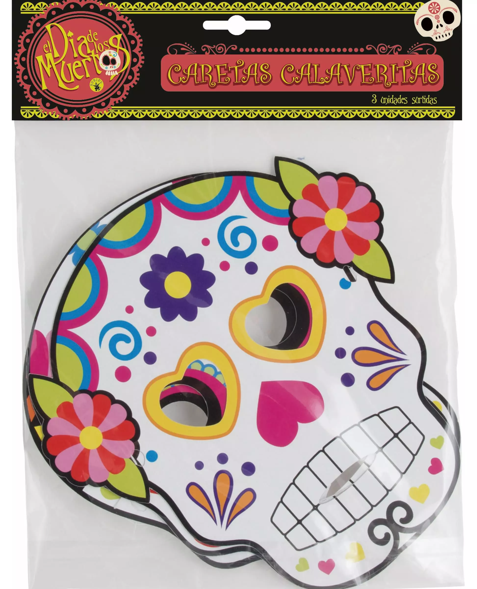 To celebrate Halloween like in Mexico! This set of 3 cardboard Dia de los muertos masks is for adults. Each mask measures 17.5cm wide and 22.5cm long. They have very colorful patterns with openings at the eyes and mouth. An elastic string behind the masks will allow a good hold. Celebrate Halloween like the Mexicans in the very trendy "Dia de los muertos" theme.. Accessories included: Set of 3 masks Material: Cardboard