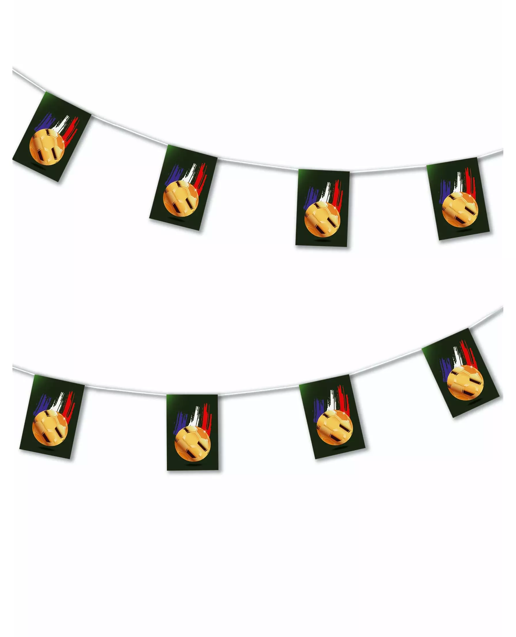 A golden balloon garland! This garland is made of paper. It measures approximately 4.5 m in length and has small black flags with a golden balloon printed in the center. Decorate your room with this garland for a 100% football-themed decor for your football-loving son's birthday. Accessories included: 1 Garland Material: Paper