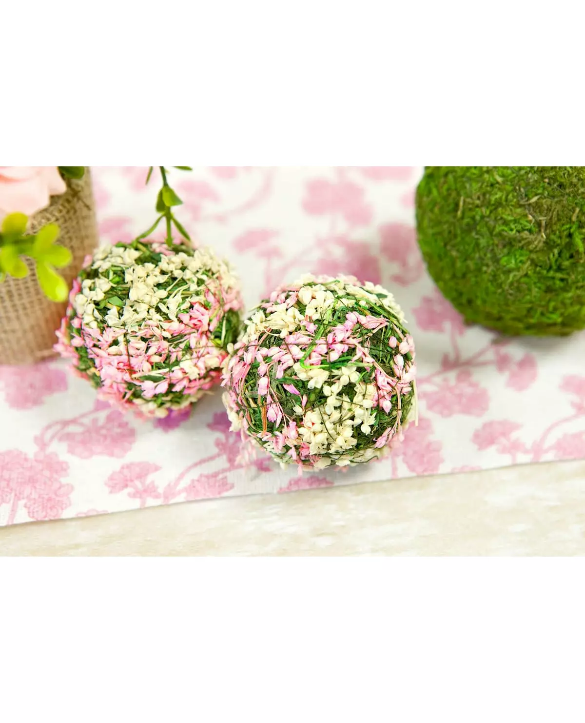 Magnificent flower balls! These 4 decorative balls are made up of small natural pink and white flowers. They measure approximately 5 cm in diameter. These magnificent flower balls will be perfect for a rustic or natural wedding table. Accessories included - 4 Balls