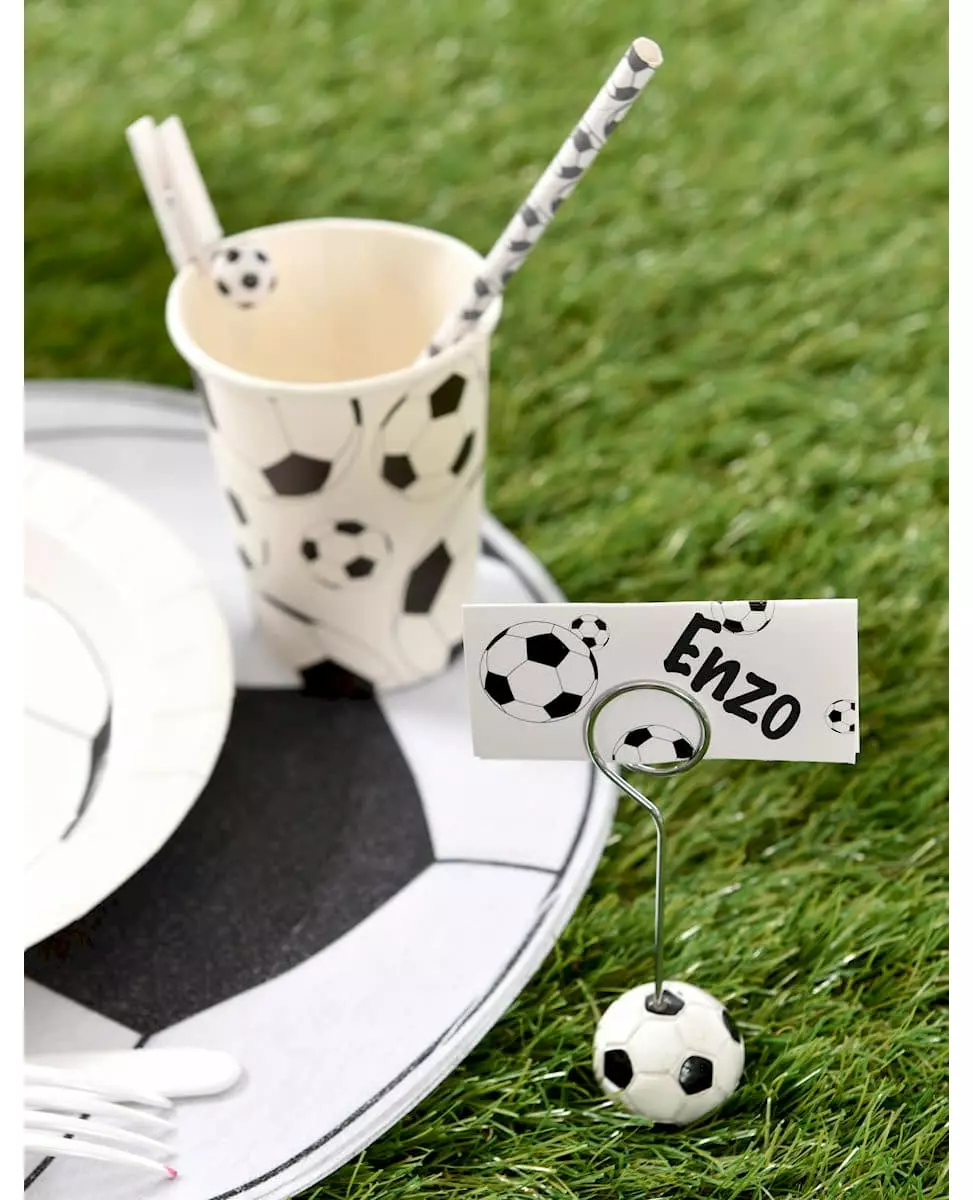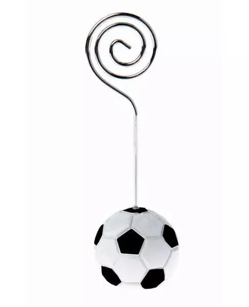 Sports place cards! These 4 football place cards are made of metal and plastic. The base is shaped like a football with a spiral rod that will allow you to attach the papers with the names of the guests. These place cards will add the finishing touch to your table decoration for a birthday or a football evening with friends. Accessories included: 4 Place Cards