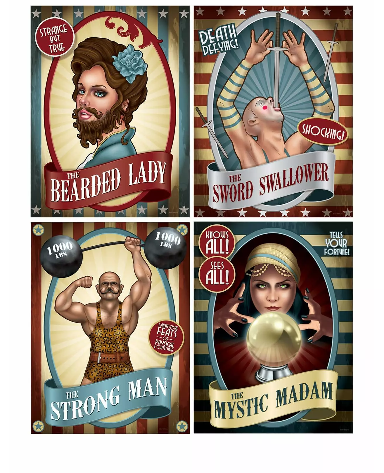Enter the big top! These vintage circus posters are sold in sets of 4. Each measures approximately 38 cm. Each poster features a different circus artist. These posters are perfect for completing a vintage circus-themed decor! Accessories included: 4 Posters