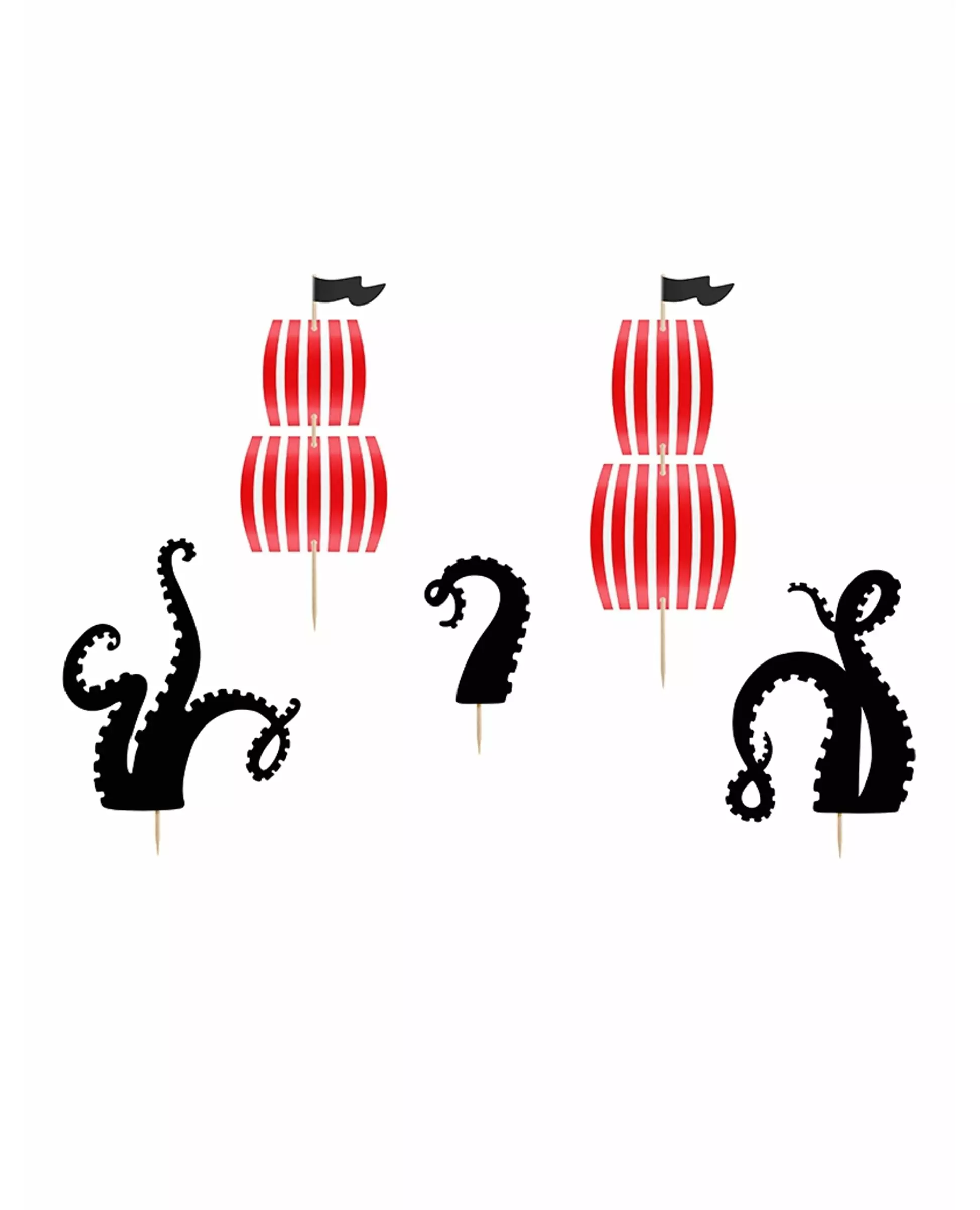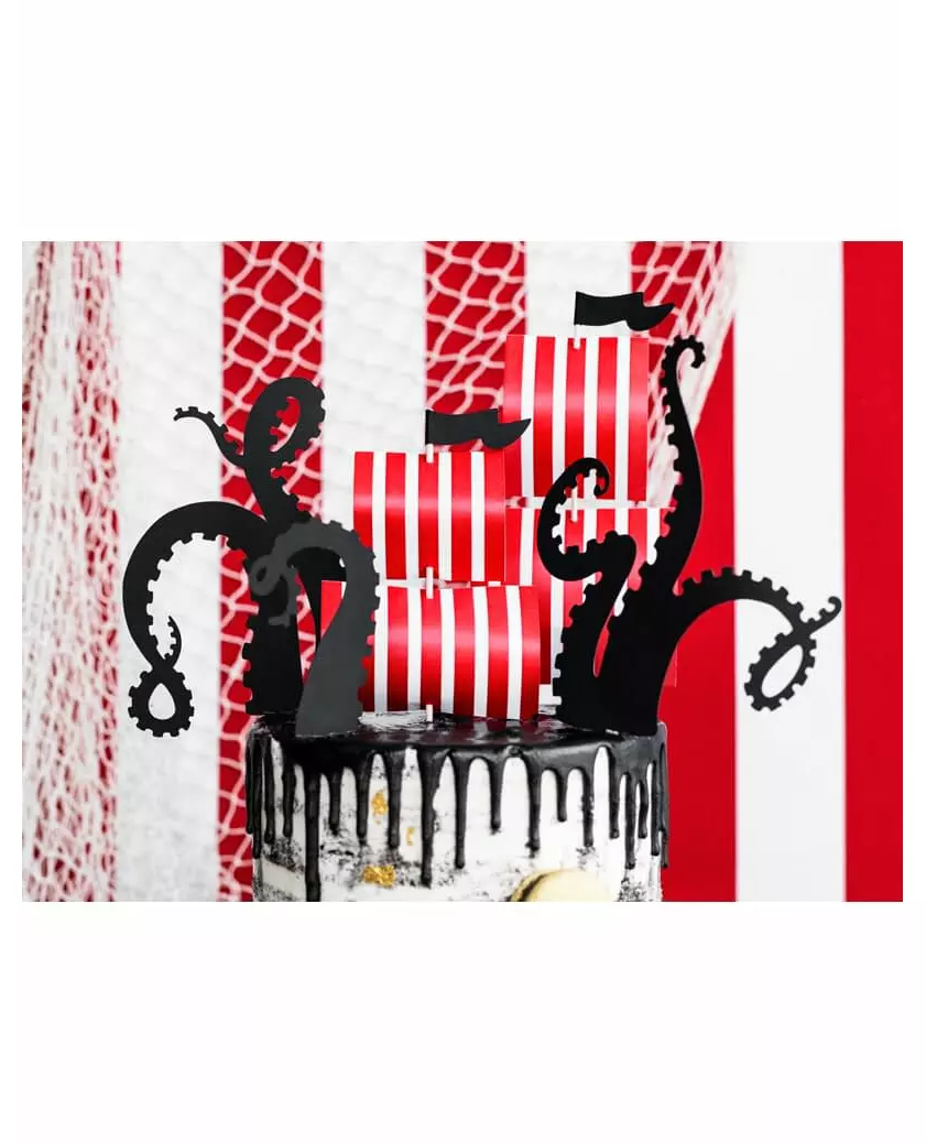 For a real pirate cake! This set is made up of 5 pirate-themed cake decorations. They are made of cardboard and measure between 13.5 and 21.5 cm. In this set you will find 3 black tentacles and 2 pirate ship masts with red and white striped sails. All these decorations are mounted on picks so you can easily place them on your cake! This set will be ideal for a pirate-themed birthday cake! Accessories included: 5 Cake decorations Material: Cardboard