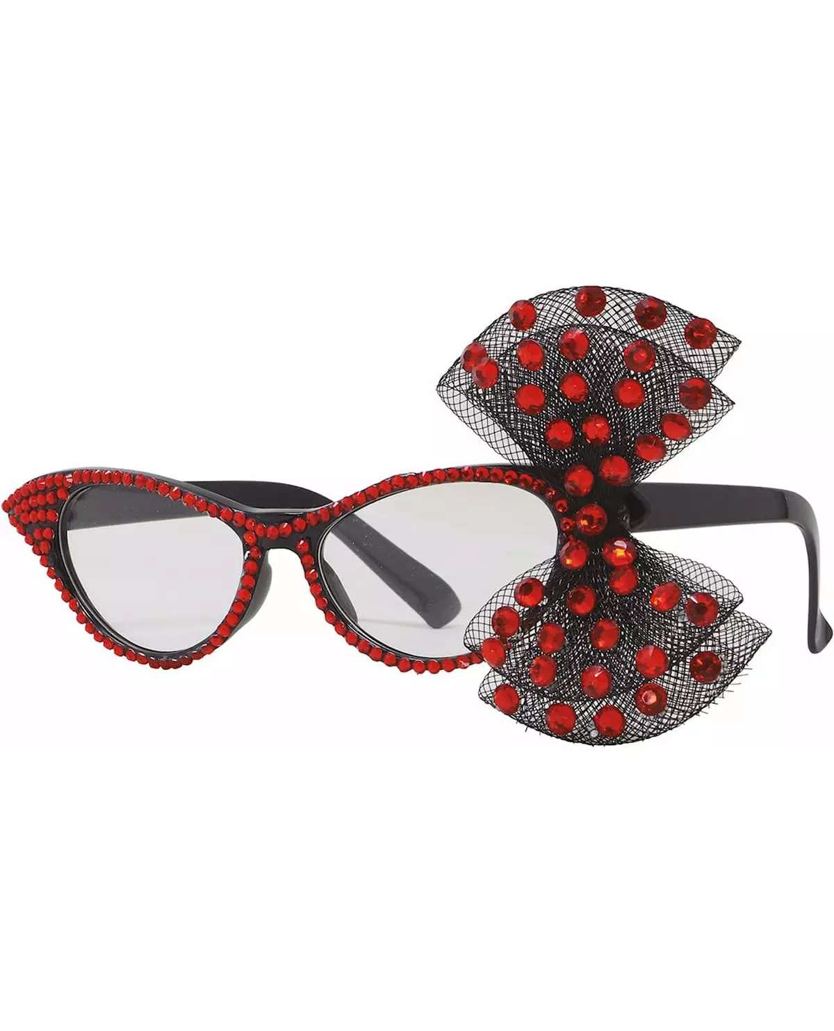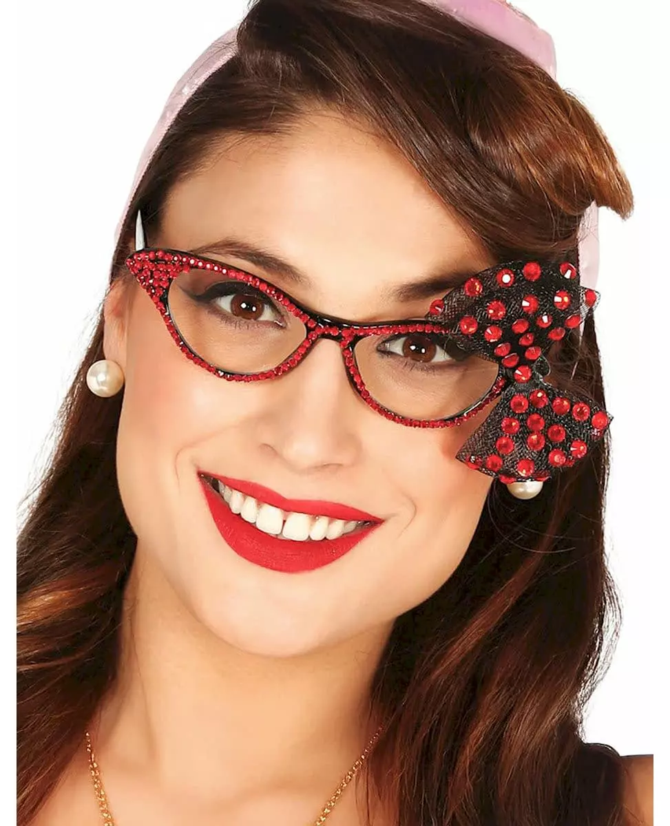 Do you, Do you Saint-Tropez?! This pair of 50s glasses is for women. These butterfly-shaped glasses, typical of the 50s, are black. They are covered in red glitter and have a black bow with red glitter on one side of the temples. These chic and original glasses will be ideal to complete a 50s costume in shades of red and black for a theme party or carnival!. Accessories included: Glasses
