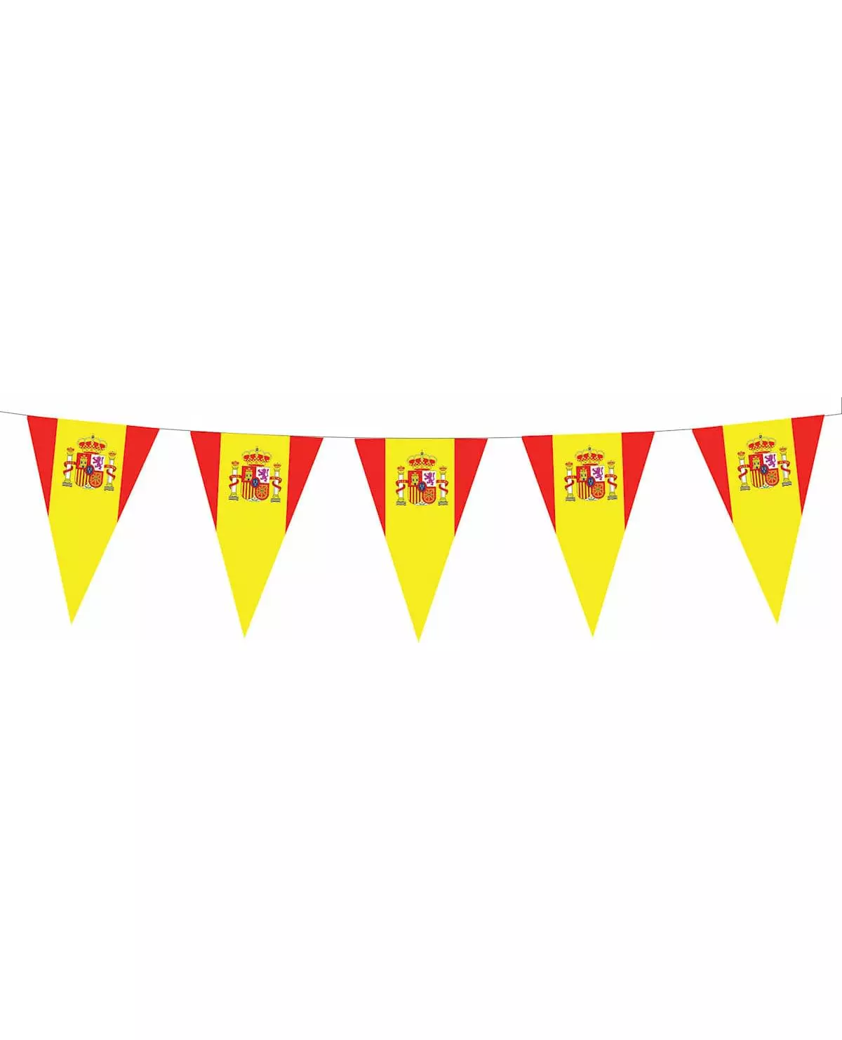 Viva España! This plastic garland measures approximately 5 meters long. Each pennant represents the flag of Spain. These pennants measure approximately 26 x 21 cm. This garland will be perfect for decorating a room to celebrate the victory of your favorite football team or for a Spanish-themed party. Accessories included: Garland