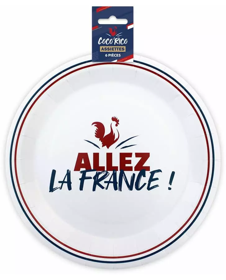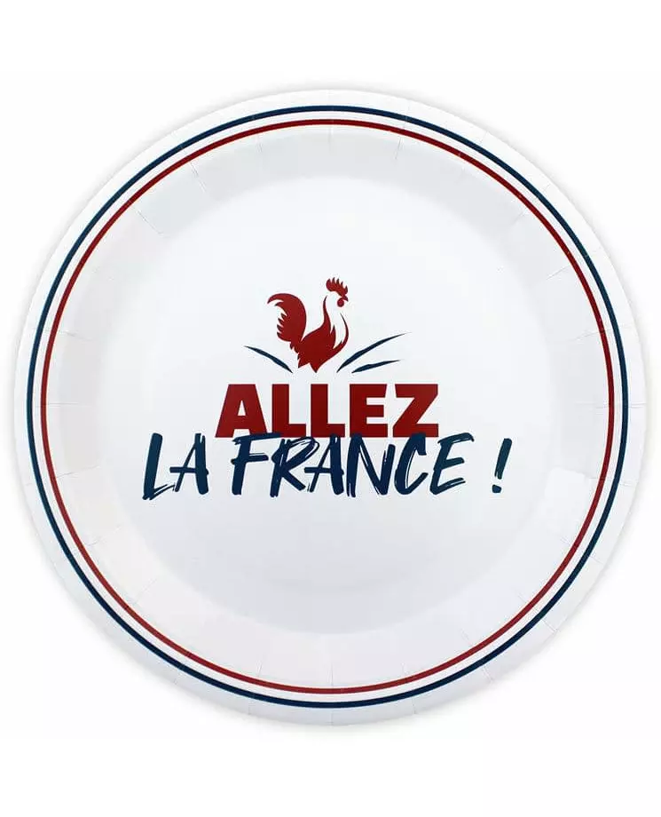 Allez la France! These 23 cm diameter paper plates are perfect for your sports-themed parties. With an elegant design, they feature the words "Allez la France!" in blue and red, as well as the famous French rooster in red. The edges are elegantly decorated with thin red and blue stripes, adding a touch of elegance. These plates are ideal for serving your snacks and meals at your sporting events and fan parties, while showing your support for the French team! Accessories included: 6 plates Material: -Cardboard