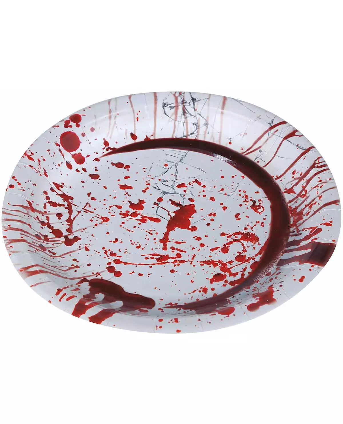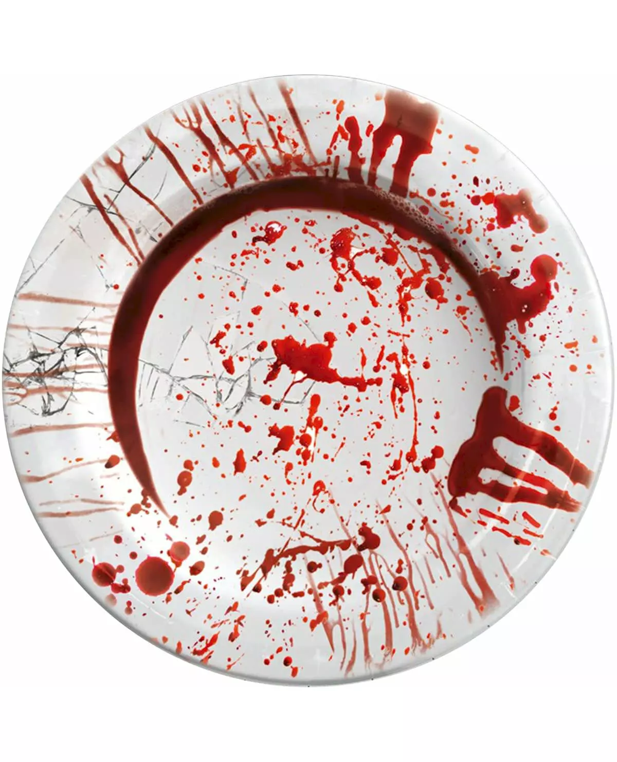 Go for a bloody Halloween decoration! This set consists of 6 cardboard plates. These are white with handprints and blood stains. These plates measure approximately 23 cm in diameter. They will be perfect to complete your bloody table decoration for Halloween or for a horror-themed party. Accessories included: 6 Plates Material: Cardboard
