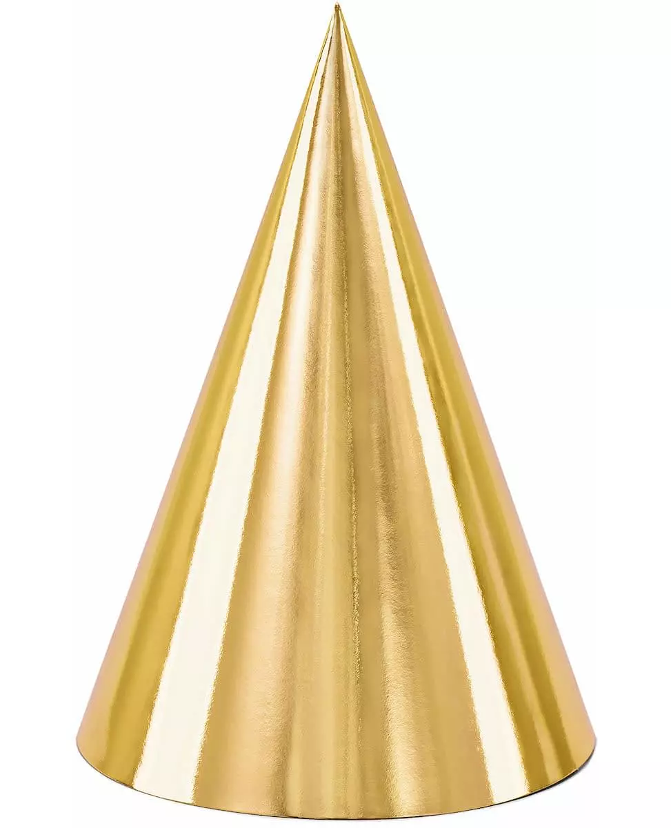 Gold party hats! This set includes 6 cardboard party hats, each approximately 16 cm tall. They are gold in color and add a bright, festive touch to any celebration. Perfect for a birthday, New Year's Eve, or any other colorful party. Accessories included: 6 Party Hats Material: Cardboard