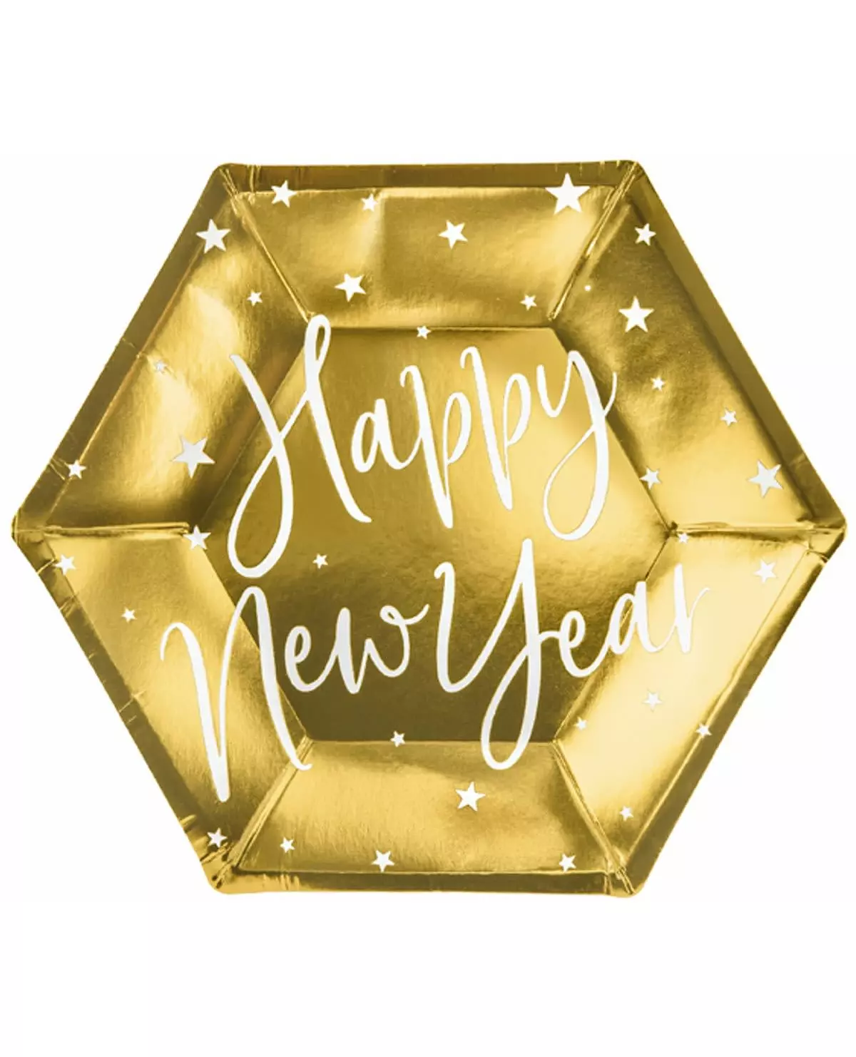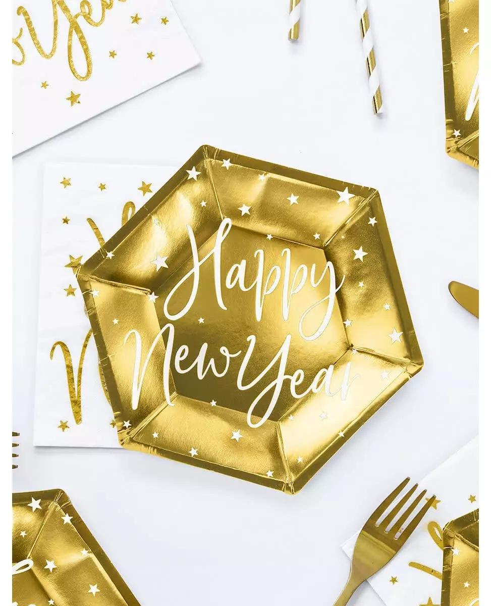 Add some gold to your New Year's table! This set contains 6 paper plates. They are gold and measure approximately 20 cm in diameter. They are characterized by their octagonal shape and are decorated with the inscription "Happy New Year". For New Year's, choose these gold paper plates for a beautiful, chic table!. Accessories included: 6 Plates Material: Cardboard