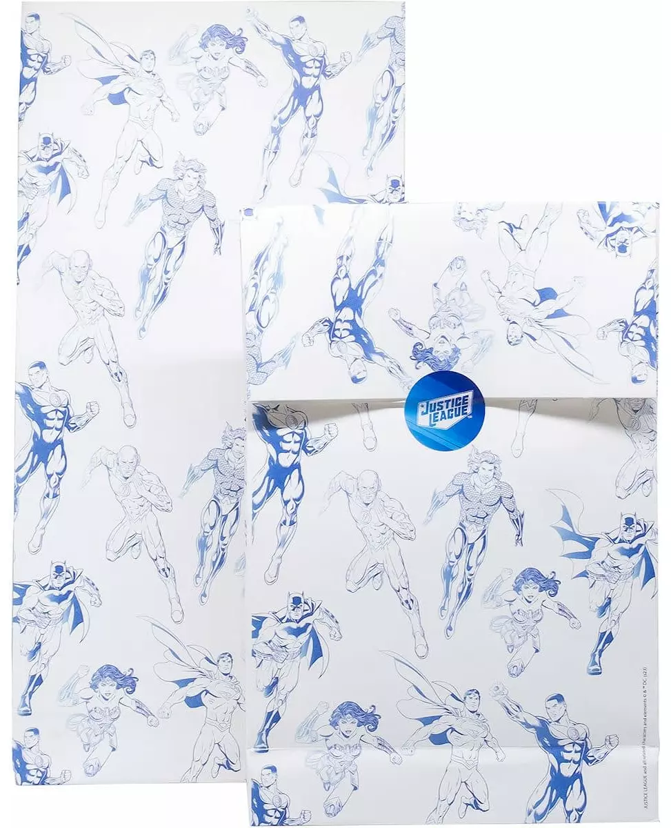 Justice League! This pack includes 8 officially licensed Justice League™ bags. Made of kraft paper, they come with 8 stickers. Measuring approximately 30 x 15 cm, the stickers feature the Justice League™ logo on a blue background. You will find the iconic logos of the legendary heroes: Batman, Superman, Wonder Woman, Aquaman, Flash and Cyborg. Choose a decoration entirely dedicated to the Justice League™ to celebrate your child's birthday!. Accessories included: 8 gift bags 8 stickers