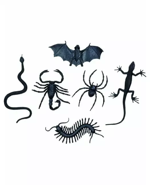 Make your guests tremble on Halloween night This kit consists of 6 small terrifying creatures: a scorpion, a tarantula, a bat, a lizard, a snake and a centipede. These measure between 8 and 15 cm. Made of black plastic, these creatures will be ideal for a horrible decoration on Halloween. Accessories included: 6 Creatures