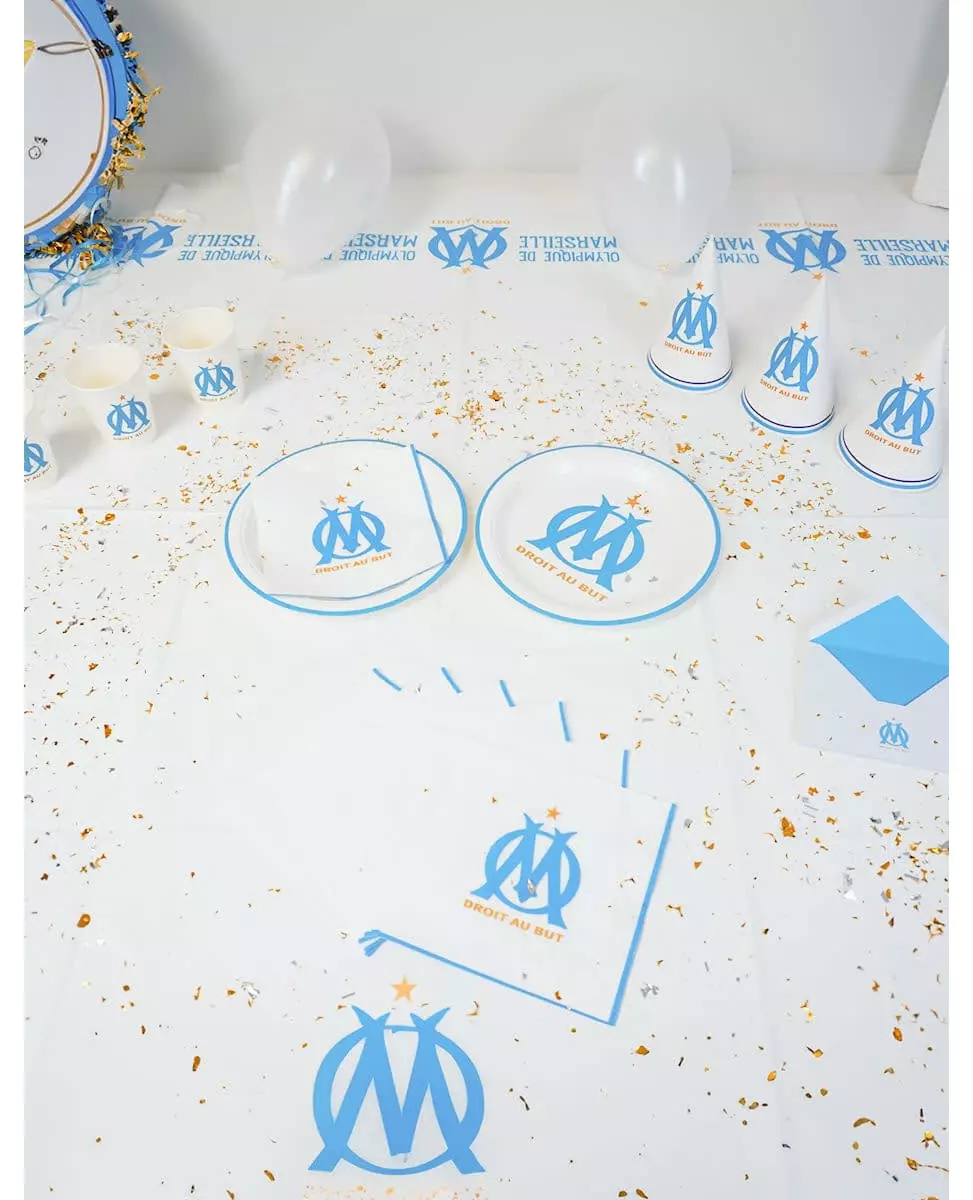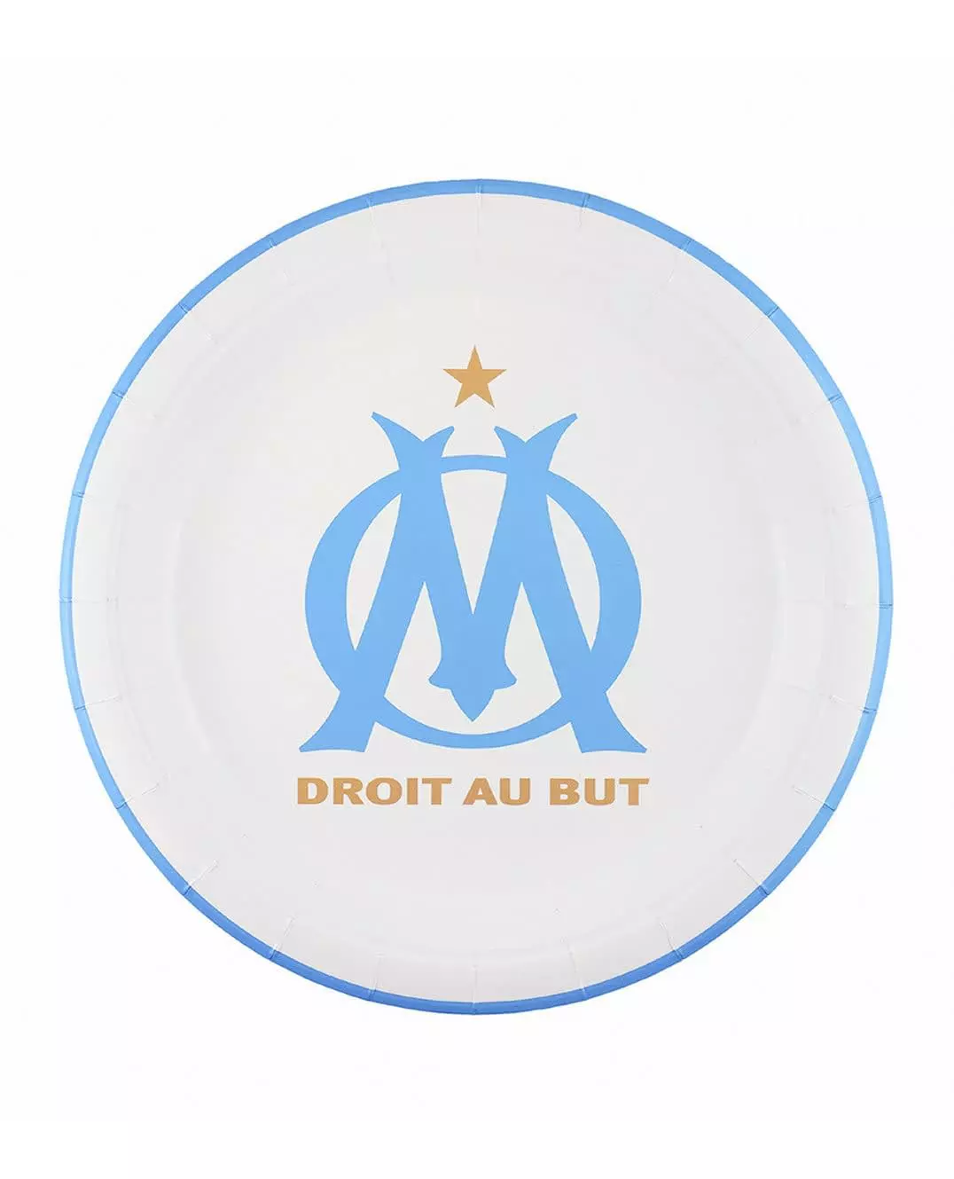 Cheers to OM™ These 6 paper plates, officially licensed by Olympique de Marseille™, are perfect for your festive events. White with a sky blue border, they feature the OM™ logo and their famous slogan "Straight to the point" in gold letters in the center. Ideal for the birthday of an OM™ fan!. Accessories included: 6 Plates Material: Cardboard
