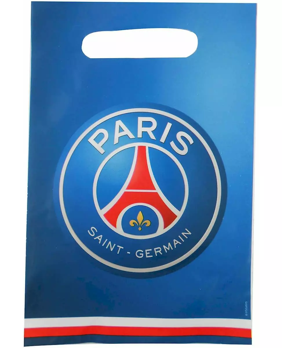 For a football birthday! This set of 6 birthday bags is officially licensed by PSG. They are made of plastic and measure approximately 15 x 23 cm. They are blue in color and feature the football club logo. The back of the bags is plain white. These party bags will be perfect for giving little surprises to your child's guests at their football-themed birthday party. Accessories included: 6 Party Bags Material: Plastic