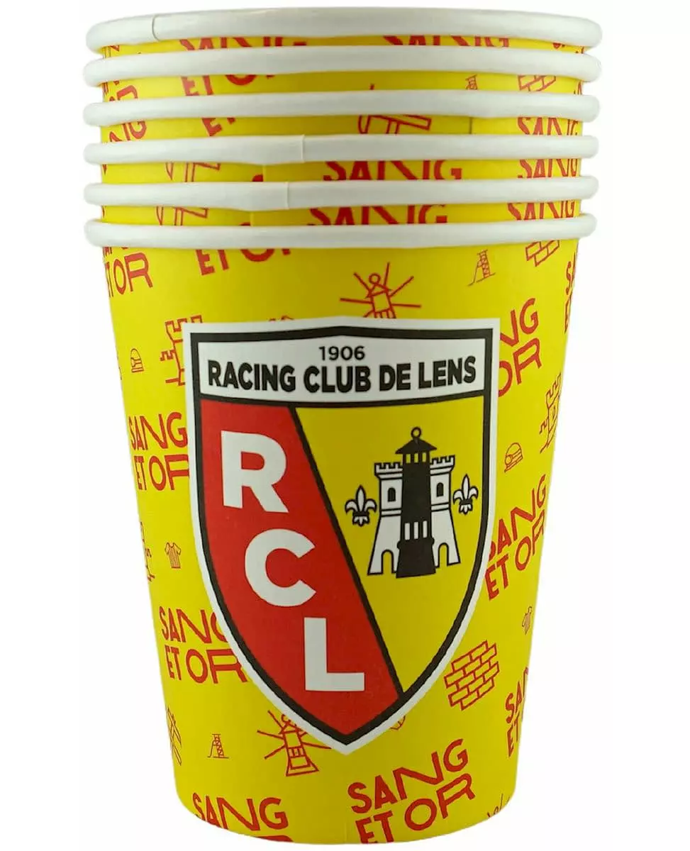 toast to the colors of RC Lens! These 6 RC Lens 25 cl cardboard cups are the perfect element to accompany your festive events in the club colors. Dressed in a bright yellow background with the Racing logo and the repeated "Blood and Gold" pattern, they bring a real touch of coherence to your decoration. Solid and easy to use, they are perfect for all occasions between supporters. An essential to share a friendly moment 100% Lensois!. Accessories included: 6 cups Material: Cardboard