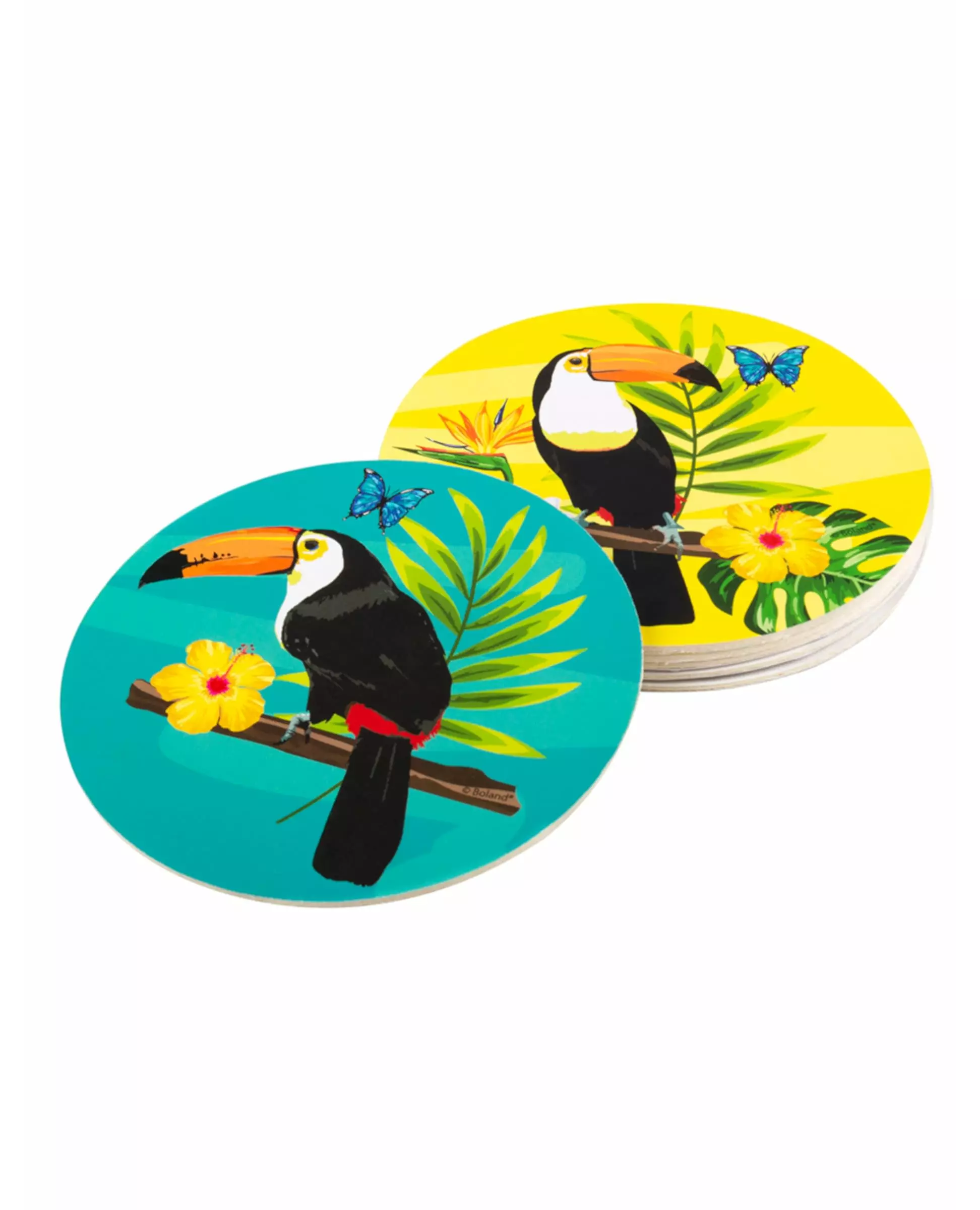 Toucan Cardboard Coasters 10 cm Pretty toucans to accompany your glasses. This set includes 6 cardboard coasters.