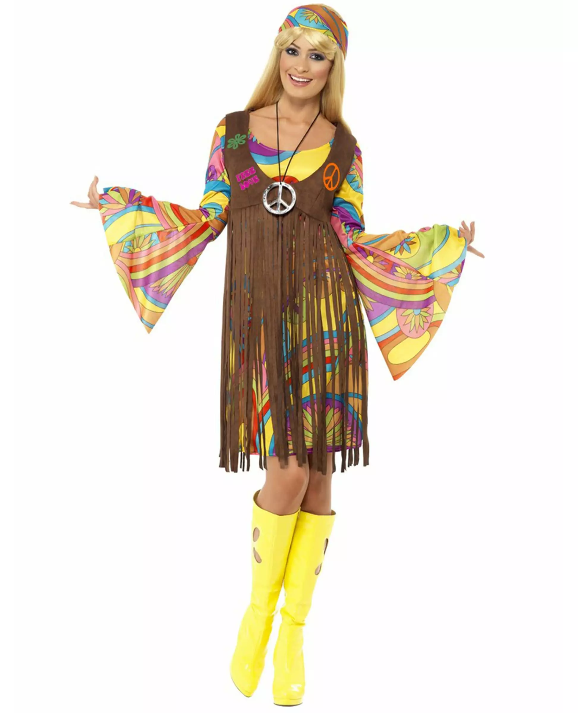 Be completely hippie! This hippie costume for women is composed of a very colorful flower dress, a fringed vest to wear over the dress and a headband. The flared sleeves will perfectly represent the 70s style, the realism of this costume will totally seduce you. This set will allow you to put yourself in the shoes of a woman from this famous era. The flower hippie costume for women is ideal for all your retro-themed parties. Accessories included: Dress Vest Headband Material: Polyester Care: Hand wash