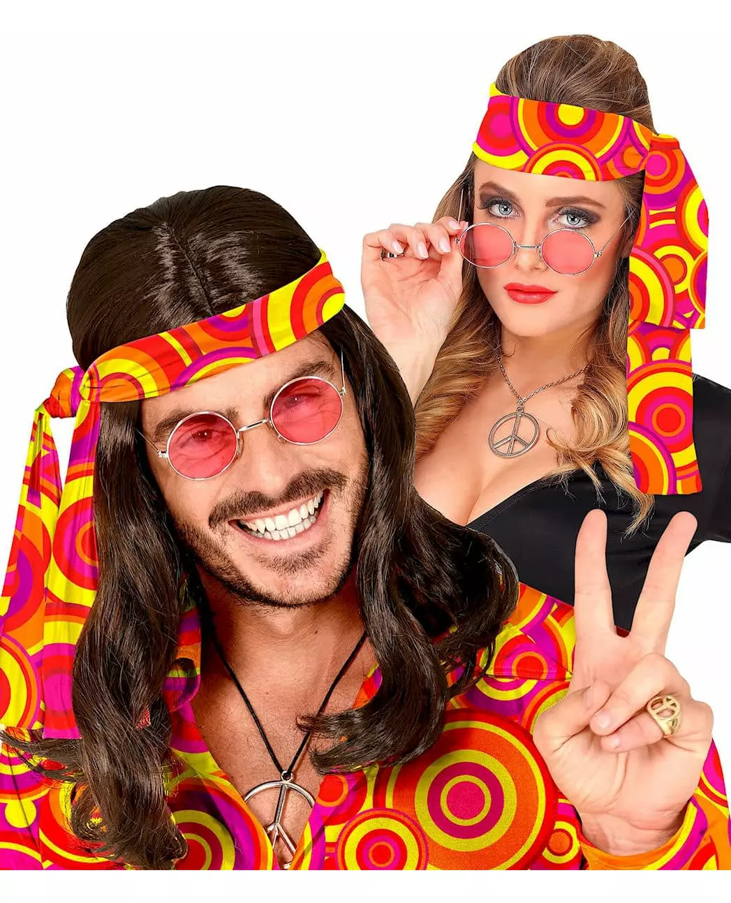 Complete your disco costume with this colorful headband This 70s headband for women is made from a fabric with round patterns, in yellow, orange, red, and purple. It simply ties around the head. This headband will be perfect to complete a disco costume for Carnival or a 70s themed party. Accessories included: Headband Material: 100% Polyester