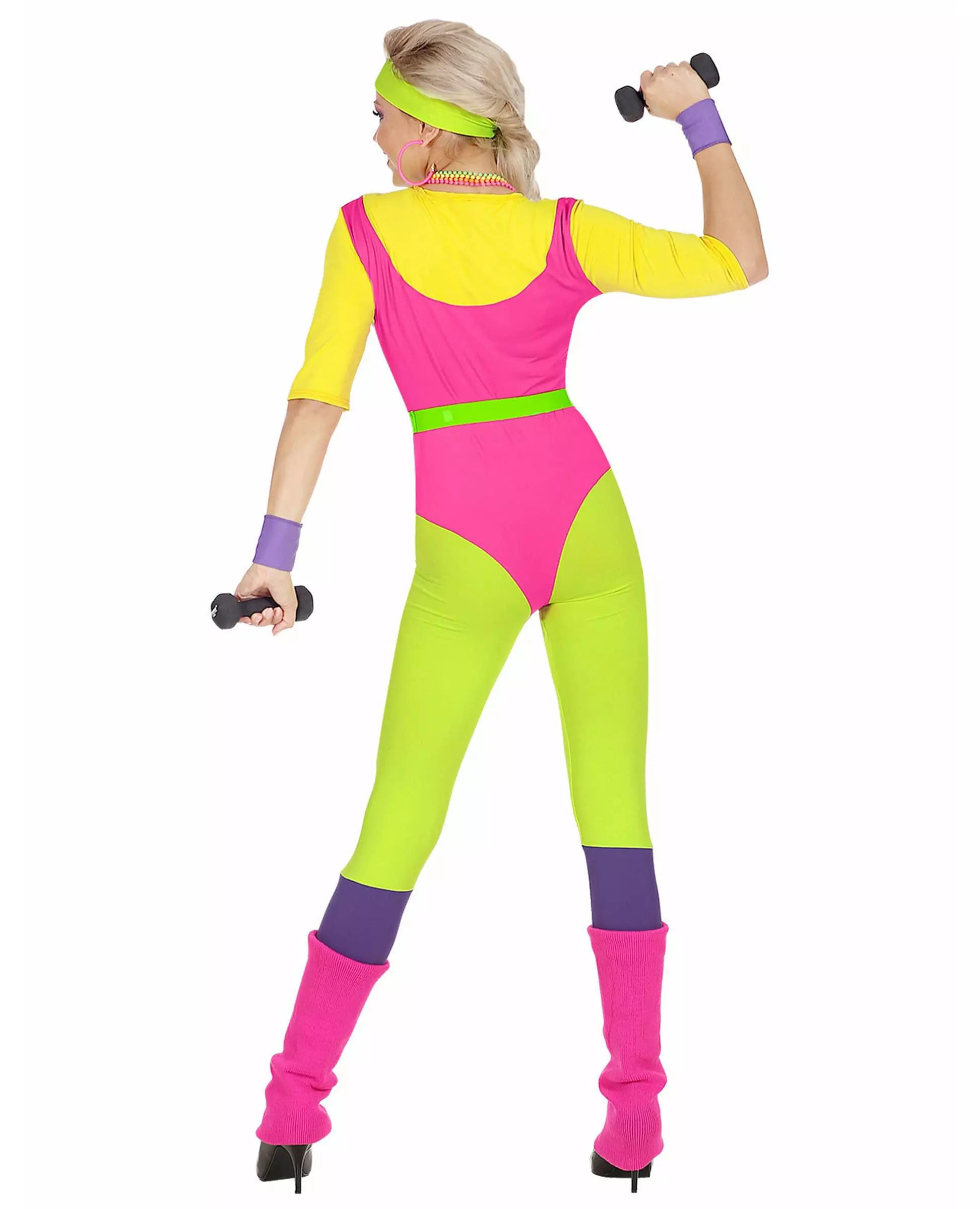 Get into 80s fashion with this aerobics teacher costume. This women's aerobics teacher costume includes a jumpsuit, a belt, a headband, and bracelets (dumbbells, jewelry, leg warmers, and shoes not included). The elastic jumpsuit is yellow on the top and green and purple on the bottom. A pink bodysuit is also printed in the center. The thin belt is green and will highlight the waist. The headband is green. It is placed on the top of the head. The wide bracelets are purple. This colorful costume will be perfect for pretending you're an 80s sports teacher at a retro party or for Carnival. Accessories included: Jumpsuit Belt Headband 2 Bracelets Material: 100% Polyester Care: Hand wash
