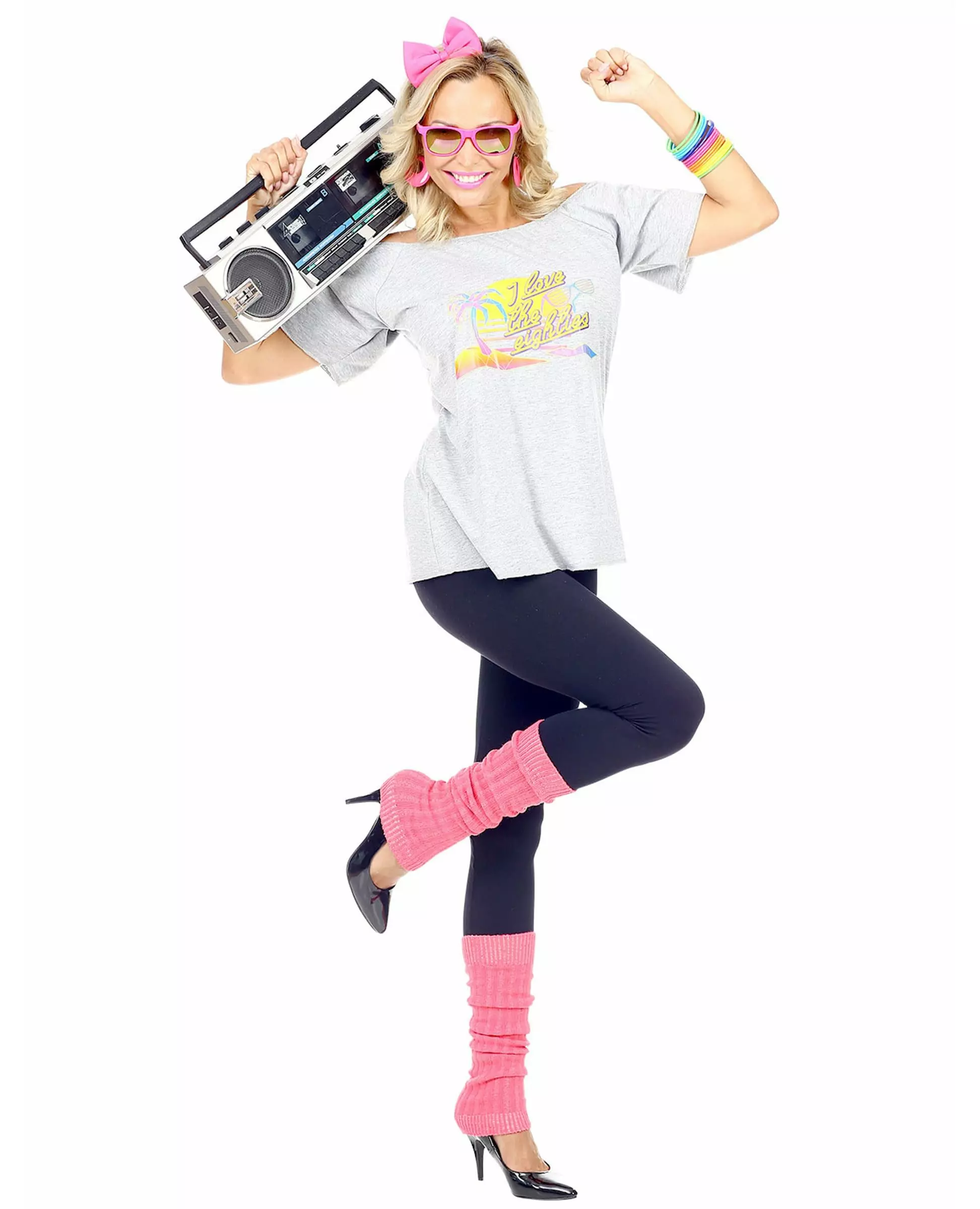 Relive the 80s in this vibrant costume! This beach girl costume for women consists of a top, a hair bow and leg warmers (glasses, jewelry, radio and pants not included). The top is gray with a beach print and the message "I love the eighties". The pink bow is attached to a headband. Finally, pink leg warmers will adorn the bottom of your legs. This colorful costume will be perfect for an 80s-themed costume party. Accessories included: Top Bow 2 Leg warmers Material: 100% Polyester Care: Hand wash