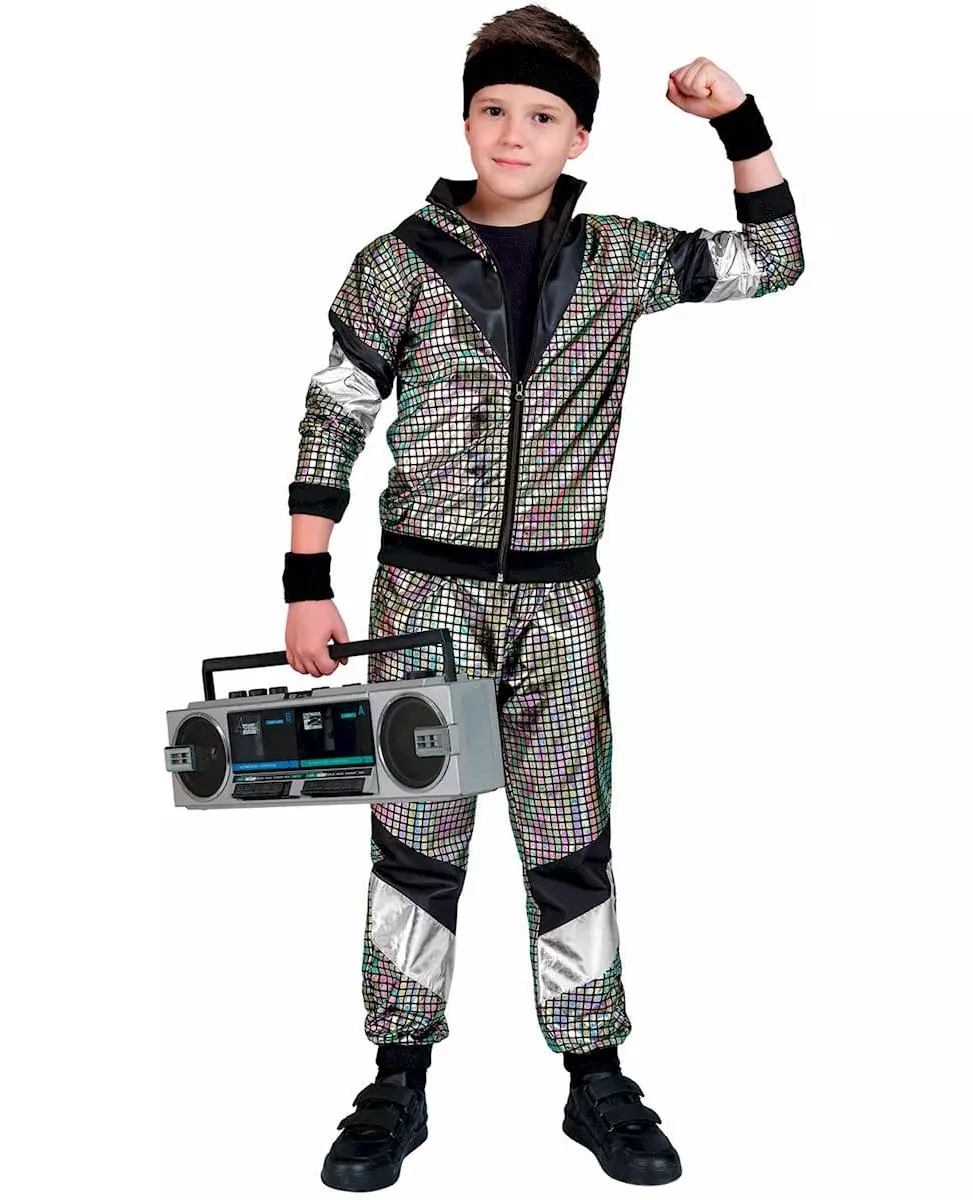 Perfect for nostalgic and stylish little dancers. The 80s disco jogging costume is for children. It consists of a dazzling jacket with multi-colored holographic reflections, designed to shine under the lights and attract all eyes. Featuring a zipper and a contrasting black collar, it combines retro style with practical comfort. The matching pants, also decorated with glitter patterns, offer a comfortable jogging cut that allows freedom of movement, ideal for dancing and playing. The black finishing bands at the waist and ankles add a stylish touch while ensuring a perfect fit. This set is ideal for recreating the energy of disco evenings, whether for costume parties, shows or carnivals, and will please all young fans of the 80s. Accessories included: 1 jacket 1 pair of pants Material: 100% polyester Care: Hand wash